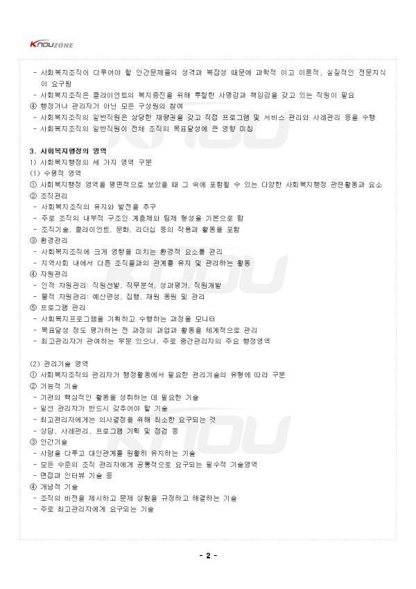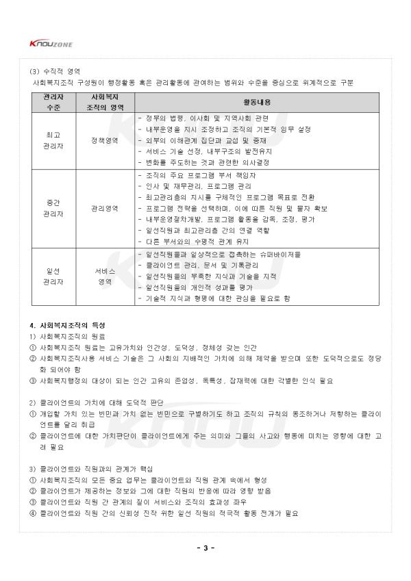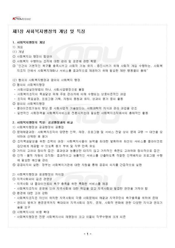1. »çȸº¹ÁöÇàÁ¤ÀÇ °³³ä 1) °³¿ä (1) °³³ä ¨ç »çȸº¹Áö¿Í ÇàÁ¤ÀÇ ÇÕ¼º¾î ¨è »çȸº¹Áö ¼öÇàÇÏ´Â Á¶Á÷¿¡ ´ëÇÑ °ü¸® ¹× ¿î¿µ¿¡ °üÇÑ Çй® ¨é¡°Àΰ£ÀÇ ±âº»ÀûÀÎ ¿å±¸¸¦ ÃæÁ·½ÃŰ°í »çȸÀû ±â´É À¯Áö ․ ÁõÁø½Ã۱â À§ÇØ »çȸÀû °³ÀÔ ¼öÇàÇÏ´Â, »çȸº¹ÁöÁ¶Á÷ ¾È¿¡¼ »çȸº¹ÁöÀçȳª ¼ºñ½º¸¦ È¿°úÀûÀ¸·Î Á¦°øÇϱâ À§ÇØ ÇÊ¿äÇÑ Á¦¹Ý ÇൿµéÀÇ ÃÑü¡± (2) ÇùÀÇÀÇ »çȸº¹ÁöÇàÁ¤°ú ±¤ÀÇÀÇ »çȸº¹Áö ÇàÁ¤ ¨ç ÇùÀÇÀÇ »çȸº¹ÁöÇàÁ¤ - »çȸ»ç¾÷½Çõ¹æ¹ýÀÇ Çϳª, »çȸ»ç¾÷ÇàÁ¤À¸·Î ºÒ¸² - »çȸº¹ÁöÁ¶Á÷ÀÇ ¸ñÇ¥´Þ¼º À§ÇØ ÁÖ·Î °ü¸®ÀÚ¿¡ ÀÇÇØ ¼öÇàµÇ´Â »óÈ£ÀÇÁ¸ÀûÀÎ °ú¾÷ - Á¶Á÷ÀÇ ¸ñÇ¥¼³Á¤, ÇÁ·Î±×·¥ ±âȹ, ÀÚ¿øÀÇ µ¿¿ø°ú À¯Áö, ¼º°úÀÇ Æò°¡ µîÀÇ È°µ¿ ¨è ±¤ÀÇÀÇ »çȸº¹ÁöÇàÁ¤ - Ŭ¶óÀÌ¾ðÆ®±â´ÉÀÇ Çâ»ó µî »çȸ»ç¾÷Àû ±â¼úº¸´Ù´Â, »çȸ°úÇÐÀû Áö½Ä°ú °ü¸® °ú¾÷À» °Á¶ - ÀϹÝÀûÀÎ »çȸÁ¤Ã¥À» »çȸº¹Áö¼ºñ½º·Î Àüȯ½Ã۴µ¥ ÇÊ¿äÇÑ »çȸº¹ÁöÁ¶Á÷¿¡¼ÀÇ ÃÑüÀûÀΠȰµ¿ 2. »çȸº¹ÁöÇàÁ¤ÀÇ Æ¯¼º: °ø°øÇàÁ¤°úÀÇ ºñ±³ 1) »çȸº¹ÁöÇàÁ¤°ú °ø°øÇàÁ¤ÀÇ °øÅëÁ¡ ¨ç ¹®Á¦Çذá°úÁ¤: »çȸº¹ÁöÁ¶Á÷ÀÌ ´ç¸éÇÑ ÀηÂ, ÀçÁ¤, ÇÁ·Î±×·¥ ¹× ¼ºñ½º Àü´Þ »óÀÇ ¹®Á¦ ±Ô¸í ¡æ ´ë¾ÈÀ» ¸ð»öÇÏ¿© ¼±ÅÃÇÑ ÈÄ Æò°¡ ¨è Á¶Á÷¸ñÇ¥´Þ¼ºÀ» À§ÇÑ Á¶·ÂÀÇ °úÁ¤: »çȸº¹Áö»çµéÀÌ ´É·ÂÀ» ÃÖ´ëÇÑ ¹ßÈÖÇÏ¿© ÃÖ¼±ÀÇ ¼ºñ½º¸¦ Ŭ¶óÀÌ¾ðÆ® Áý´Ü¿¡°Ô Á¦°øÇÒ ¼ö ÀÖµµ·Ï µ¿±â ºÎ¿© ¹× Á÷¹« ¸¸Á· À¯µµ ¨é °¡Ä¡ÀÇ °í·Á¿Í âÀÇÀû Á¢±Ù: È¿°ú¼º°ú ´É·ü¼º¸¸ µûÁöÁö ¾Ê°í °¡Ä¡ÀûÀÎ Ãø¸éµµ °í·ÁÇϸç âÀÇÀûÀ¸·Î Á¢±Ù ¨ê ÀÎÀû ․ ¹°Àû ÀÚ¿øÀÇ Á¶Á÷È: È¿°úÀûÀÌ°í ´É·üÀûÀÎ ¼ºñ½º¸¦ »êÃâÇϵµ·Ï ÀûÀýÇÑ Àη¹èÄ¡¿Í ÇÁ·Î±×·¥ ¼öÇà¿¡ ÇÊ¿äÇÑ ¿¹»êÀ» °ü¸® ¨ë °ø°øÀÇÁöÀÇ ½ÇÇö: Á¤ºÎ´Â »çȸº¹Áö±â°ü¿¡ ´ëÇÑ Áö¿øÀ» ÅëÇØ °ø°øÀÇ ÀÇÁö¸¦ °£Á¢ÀûÀ¸·Î ½ÇÇö 2) »çȸº¹ÁöÇàÁ¤°ú °ø°øÇàÁ¤ÀÇ Â÷ÀÌÁ¡ ¨ç Áö¿ª»çȸ¿ÍÀÇ ±íÀº °ü·Ã¼º - Áö¿ª»çȸ ³» Ŭ¶óÀ̾ðÆ®ÀÇ ¿å±¸ ÃæÁ·À» À§ÇÑ Æ¯ÈµÈ ¼ºñ½º¸¦ Á¦°ø - »çȸº¹ÁöÁ¶Á÷ÀÇ ¿î¿µ¿¡ ÀÖ¾î Áö¿ª»çȸ¿¡ ´ëÇÑ Ã¥ÀÓÀ» °®°í Áö¿ª»çȸ¿Í ¹ÐÁ¢ÇÑ °ü·ÃÀ» °¡Á®¾ß ÇÔ ¨è ȯ°æ¿¡ ´ëÇÑ °í·Á °È - »çȸº¹ÁöÁ¶Á÷Àº ÀÚ½ÅÀÌ À§Ä¡ÇÑ Áö¿ª»çȸÀÇ °¢Á¾ »çȸ¹®Á¦ÀÇ ÇØ°á°ú Áö¿ªÁÖ¹ÎÀÇ ¿å±¸ÃæÁ·À» À§ÇÏ¿© Á¸Àç - °ü¸®ÀÇ ¹üÀ§°¡ ȯ°æ¿µ¿ª±îÁö È®´ëµÇ¾î Áö¿ª»çȸÀÇ Á¤Ä¡, °æÁ¦, »çȸÀû º¯È¿¡ °üÇÑ ´Ù¾çÇÑ Áö½Ä°ú °ü¸®±â¼úÀ» ¿ä±¸ ¨é »çȸº¹Áö»çÀÇ ºñÁß È®´ë - »çȸº¹ÁöÇàÁ¤Àº Àü¹® »çȸº¹Áö»çÀÇ Àç·®±ÇÀÌ Å©°í À̵éÀÇ Á÷¹«¼öÇà¿¡ Å©°Ô ÀÇÁ¸ - »çȸº¹ÁöÁ¶Á÷ÀÌ ´Ù·ç¾î¾ß ÇÒ Àΰ£¹®Á¦µéÀÇ ¼º°Ý°ú º¹À⼺ ¶§¹®¿¡ °úÇÐÀû À̰í ÀÌ·ÐÀû, ½ÇÁúÀûÀÎ Àü¹®Áö½ÄÀÌ ¿ä±¸µÊ - »çȸº¹ÁöÁ¶Á÷Àº Ŭ¶óÀ̾ðÆ®ÀÇ º¹ÁöÁõÁøÀ» À§ÇØ ÅõöÇÑ »ç¸í°¨°ú Ã¥ÀÓ°¨À» °®°í ÀÖ´Â Á÷¿øÀÌ ÇÊ¿ä ¨ê ÇàÁ¤°¡³ª °ü¸®ÀÚ°¡ ¾Æ´Ñ ¸ðµç ±¸¼º¿øÀÇ Âü¿© - »çȸº¹ÁöÁ¶Á÷ÀÇ ÀϹÝÁ÷¿øÀº »ó´çÇÑ Àç·®±ÇÀ» °®°í Á÷Á¢ ÇÁ·Î±×·¥ ¹× ¼ºñ½º °ü¸®¿Í »ç·Ê°ü¸® µîÀ» ¼öÇà - »çȸº¹ÁöÁ¶Á÷ÀÇ ÀϹÝÁ÷¿øÀÌ Àüü Á¶Á÷ÀÇ ¸ñÇ¥´Þ¼º¿¡ Å« ¿µÇâ ¹Ìħ 3. »çȸº¹ÁöÇàÁ¤ÀÇ ¿µ¿ª 1) »çȸº¹ÁöÇàÁ¤ÀÇ ¼¼ °¡Áö ¿µ¿ª ±¸ºÐ (1) ¼öÆòÀû ¿µ¿ª ¨ç »çȸº¹ÁöÇàÁ¤ ¿µ¿ªÀ» Æò¸éÀûÀ¸·Î º¸¾ÒÀ» ¶§ ±× ¼Ó¿¡ Æ÷Ç﵃ ¼ö ÀÖ´Â ´Ù¾çÇÑ »çȸº¹ÁöÇàÁ¤ °ü·ÃȰµ¿°ú ¿ä¼Ò ¨è Á¶Á÷°ü¸® - »çȸº¹ÁöÁ¶Á÷ÀÇ À¯Áö¿Í ¹ßÀüÀ» Ãß±¸ - ÁÖ·Î Á¶Á÷ÀÇ ³»ºÎÀû ±¸Á¶ÀÎ °èÃþÁ¦¿Í ÆÀÁ¦ Çü¼ºÀ» ±âº»À¸·Î ÇÔ - Á¶Á÷±â¼ú, Ŭ¶óÀ̾ðÆ®, ¹®È, ¸®´õ½Ê µîÀÇ ÀÛ¿ë°ú Ȱµ¿À» Æ÷ÇÔ ¨é ȯ°æ°ü¸® - »çȸº¹ÁöÁ¶Á÷¿¡ Å©°Ô ¿µÇâÀ» ¹ÌÄ¡´Â ȯ°æÀû ¿ä¼Ò¸¦ °ü¸® - Áö¿ª»çȸ ³»¿¡¼ ´Ù¸¥ Á¶Á÷µé°úÀÇ °ü°è¸¦ À¯Áö ¹× °ü¸®Çϴ Ȱµ¿ ¨ê ÀÚ¿ø°ü¸® - ÀÎÀû ÀÚ¿ø°ü¸®: Á÷¿ø¼±¹ß, Á÷¹«ºÐ¼®, ¼º°úÆò°¡, Á÷¿ø°³¹ß - ¹°Àû ÀÚ¿ø°ü¸®: ¿¹»êÆí¼º, ÁýÇà, Àç¿ø µ¿¿ø ¹× °ü¸® ¨ë ÇÁ·Î±×·¥ °ü¸® - »çȸº¹ÁöÇÁ·Î±×·¥À» ±âȹÇÏ°í ¼öÇàÇÏ´Â °úÁ¤À» ¸ð´ÏÅÍ - ¸ñÇ¥´Þ¼º Á¤µµ Æò°¡ÇÏ´Â Àü °úÁ¤ÀÇ °ú¾÷°ú Ȱµ¿À» ü°èÀûÀ¸·Î °ü¸® - ÃÖ°í°ü¸®ÀÚ°¡ °ü¿©ÇÏ´Â ºÎºÐ ÀÖÀ¸³ª, ÁÖ·Î Áß°£°ü¸®ÀÚÀÇ ÁÖ¿ä ÇàÁ¤¿µ¿ª (2) °ü¸®±â¼ú ¿µ¿ª ¨ç »çȸº¹ÁöÁ¶Á÷ÀÇ °ü¸®ÀÚ°¡ ÇàÁ¤È°µ¿¿¡¼ ÇÊ¿äÇÑ °ü¸®±â¼úÀÇ À¯Çü¿¡ µû¶ó ±¸ºÐ ¨è ±â´ÉÀû ±â¼ú - ±â°üÀÇ ÇÙ½ÉÀûÀΠȰµ¿À» ¼ºÃëÇÏ´Â µ¥ ÇÊ¿äÇÑ ±â¼ú - Àϼ± °ü¸®ÀÚ°¡ ¹Ýµå