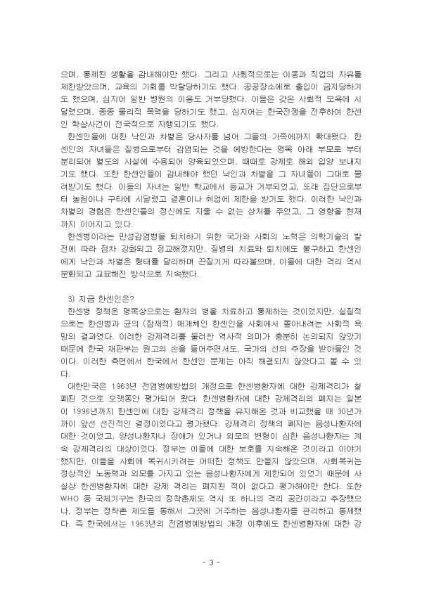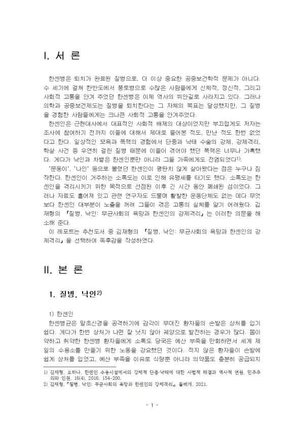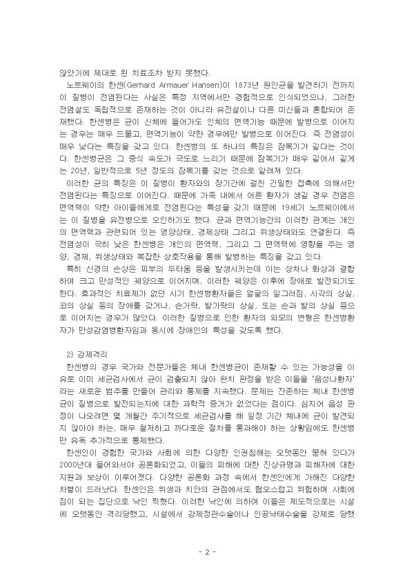 ÇѼ¾º´Àº ÅðÄ¡°¡ ¿Ï·áµÈ Áúº´À¸·Î, ´õ ÀÌ»ó Áß¿äÇÑ °øÁߺ¸°ÇÇÐÀû ¹®Á¦°¡ ¾Æ´Ï´Ù. ¼ö ¼¼±â¿¡ °ÉÃÄ Çѹݵµ¿¡¼ dzÅ亴À¸·Î ¼ö¸¹Àº »ç¶÷µé¿¡°Ô ½ÅüÀû, Á¤½ÅÀû, ±×¸®°í »çȸÀû °íÅëÀ» ¾È°Ü ÁÖ¾ú´ø ÇѼ¾º´Àº ÀÌÁ¦ ¿ª»çÀÇ µÚ¾È±æ·Î »ç¶óÁö°í ÀÖ´Ù. ±×·¯³ª ÀÇÇаú °øÁߺ¸°ÇÁ¦µµ´Â Áúº´À» ÅðÄ¡ÇÑ´Ù´Â ±× ÀÚüÀÇ ¸ñÇ¥´Â ´Þ¼ºÇßÁö¸¸, ±× Áúº´À» °æÇèÇÑ »ç¶÷µé¿¡°Ô´Â Å©³ªÅ« »çȸÀû °íÅëÀ» ¾È°ÜÁÖ¾ú´Ù. ÇѼ¾ÀÎÀº ±ÙÇö´ë»ç¿¡¼ ´ëÇ¥ÀûÀÎ »çȸÀû ¹èÁ¦ÀÇ ´ë»óÀ̾úÁö¸¸ ºÎ²ô·´°Ôµµ ÀúÀÚ´Â Á¶»ç¿¡ Âü¿©Çϱâ Àü±îÁö À̵鿡 ´ëÇØ¼ Á¦´ë·Î µé¾îº» Àûµµ, ¸¸³ Àûµµ Çѹø ¾ø¾ú´Ù°í ÇÑ´Ù. ÀÏ»óÀûÀÎ ¸ð¿å°ú Æø·ÂÀÇ °æÇè¿¡¼ ´ÜÁ¾°ú ³«Å ¼ö¼úÀÇ °Á¦, °Á¦°Ý¸®, ÇÐ»ì »ç°Ç µî ¿ì¿¬È÷ °É¸° Áúº´ ¶§¹®¿¡ À̵éÀÌ °Þ¾î¾ß Çß´ø Æø·ÂÀº ³Ê¹«³ª °¡È¤Çß´Ù. °Ô´Ù°¡ ³«Àΰú Â÷º°Àº ÇѼ¾ÀλӸ¸ ¾Æ´Ï¶ó ±×µé °¡Á·¿¡°Ôµµ Àü¿°µÇ¾ú´Ù. ¡®¹®µÕÀÌ¡¯, ¡®³ªÀΡ¯ µîÀ¸·Î ºÒ·È´ø ÇѼ¾ÀÎÀÌ Æòźġ ¾Ê°Ô »ì¾Æ¿Ô´Ù´Â Á¡Àº ´©±¸³ª ÁüÀÛÇÑ´Ù. ÇѼ¾ÀÎÀÌ °ÅÁÖÇÏ´Â ¼Ò·Ïµµ´Â ÀÌ·Î ÀÎÇØ À¯¸í¼¼¸¦ Ÿ±âµµ Çß´Ù. ¼Ò·Ïµµ´Â ÇѼ¾ÀÎÀ» °Ý¸®½Ã۱â À§ÇÑ ¸ñÀûÀ¸·Î ¼±Á¡µÈ ÀÌÈÄ ±ä ½Ã°£ µ¿¾È Æó¼âµÈ ¼¶À̾ú´Ù. ±×·¯³ª ÀÚ·áµµ Èð¾îÁ® ÀÖ°í °ü·Ã ¿¬±¸ÀÚµµ µå¹°¸ç Ȱ¹ßÇÑ ¿îµ¿´Üüµµ ¾ø´Â µ¥´Ù ¹«¾ùº¸´Ù ÇѼ¾ÀÎ ´ëºÎºÐÀÌ ³ëÃâÀ» ²¨·Á ±×µéÀÌ °ÞÀº °íÅëÀÇ ½Çü¸¦ ¾Ë±â ¾î·Á¿ü´Ù. ±èÀçÇüÀÇ ¡ºÁúº´, ³«ÀÎ: ¹«±Õ»çȸÀÇ ¿å¸Á°ú ÇѼ¾ÀÎÀÇ °Á¦°Ý¸®¡»´Â ÀÌ·¯ÇÑ Àǹ®À» ÇØ¼ÒÇØ ÁØ´Ù. ÀÌ ·¹Æ÷Æ®´Â Ãßõµµ¼ Áß ±èÀçÇüÀÇ ¡ºÁúº´, ³«ÀÎ: ¹«±Õ»çȸÀÇ ¿å¸Á°ú ÇѼ¾ÀÎÀÇ °Á¦°Ý¸®¡»À» ¼±ÅÃÇÏ¿© µ¶ÈݨÀ» ÀÛ¼ºÇÏ¿´´Ù. II. º» ·Ð 1. Áúº´, ³«ÀÎ 1) ÇѼ¾ÀÎ ÇѼ¾º´±ÕÀº ¸»ÃʽŰæÀ» °ø°ÝÇϱ⿡ °¨°¢ÀÌ ¹«µ®Áø ȯÀÚµéÀÇ ¼Õ¹ßÀº »óó¸¦ ÀԱ⠽±´Ù. °Ô´Ù°¡ Çѹø »óó°¡ ³ª¸é Àß ³´Áö ¾Ê¾Æ ±Ë¾çÀ¸·Î ¹ßÀüÇÏ´Â °æ¿ì°¡ ¸¹´Ù. ¸öÀÌ ¾àÇϰí Ãë¾àÇÑ ÇѼ¾º´ ȯÀڵ鿡°Ô ¼Ò·Ïµµ ´ç±¹Àº ¿¹»ê ºÎÁ·À» ¸¸È¸ÇÏ¸é¼ ¼¼°è Á¦ÀÏÀÇ ¼ö¿ë¼Ò¸¦ ¸¸µé±â À§ÇÑ ³ëµ¿À» °¿äÇß´ø °ÍÀÌ´Ù. ÀûÁö ¾ÊÀº ȯÀÚµéÀÌ ¼Õ¹ß¿¡ ½±°Ô »óó¸¦ ÀÔ¾ú°í, ¿¹»ê ºÎÁ·À» ÀÌÀ¯·Î ½Ä·®»Ó ¾Æ´Ï¶ó ÀǾàǰµµ ÃæºÐÈ÷ °ø±ÞµÇÁö ¾Ê¾Ò±â¿¡ Á¦´ë·Î µÈ Ä¡·áÁ¶Â÷ ¹ÞÁö ¸øÇß´Ù. ³ë¸£¿þÀÌÀÇ ÇѼ¾(Gerhard Armauer Hansen)ÀÌ 1873³â ¿øÀαÕÀ» ¹ß°ßÇϱâ Àü±îÁö ÀÌ Áúº´ÀÌ Àü¿°µÈ´Ù´Â »ç½ÇÀº ƯÁ¤ Áö¿ª¿¡¼¸¸ °æÇèÀûÀ¸·Î ÀνĵǾúÀ¸³ª, ±×·¯ÇÑ Àü¿°¼³µµ µ¶¸³ÀûÀ¸·Î Á¸ÀçÇÏ´Â °ÍÀÌ ¾Æ´Ï¶ó À¯Àü¼³À̳ª ´Ù¸¥ ¹Ì½Åµé°ú È¥ÇյǾî Á¸ÀçÇß´Ù. ÇѼ¾º´Àº ±ÕÀÌ ½Åü¿¡ µé¾î°¡µµ ÀÎüÀÇ ¸é¿ª±â´É ¶§¹®¿¡ ¹ßº´À¸·Î À̾îÁö´Â °æ¿ì´Â ¸Å¿ì µå¹°°í, ¸é¿ª±â´ÉÀÌ ¾àÇÑ °æ¿ì¿¡¸¸ ¹ßº´À¸·Î À̾îÁø´Ù. Áï Àü¿°¼ºÀÌ ¸Å¿ì ³·´Ù´Â Ư¡À» °®°í ÀÖ´Ù. ÇѼ¾º´ÀÇ ¶Ç ÇϳªÀÇ Æ¯Â¡Àº Àẹ±â°¡ ±æ´Ù´Â °ÍÀÌ´Ù. ÇѼ¾º´±ÕÀº ±× Áõ½Ä ¼Óµµ°¡ ±Øµµ·Î ´À¸®±â ¶§¹®¿¡ Àẹ±â°¡ ¸Å¿ì ±æ¾î¼ ±æ°Ô´Â 20³â, ÀϹÝÀûÀ¸·Î 5³â Á¤µµÀÇ Àẹ±â¸¦ °®´Â °ÍÀ¸·Î ¾Ë·ÁÁ® ÀÖ´Ù. ÀÌ·¯ÇÑ ±ÕÀÇ Æ¯Â¡Àº ÀÌ Áúº´ÀÌ È¯ÀÚ¿ÍÀÇ Àå±â°£¿¡ °ÉÄ£ ±ä¹ÐÇÑ Á¢ÃË¿¡ ÀÇÇØ¼¸¸ Àü¿°µÈ´Ù´Â Ư¡À¸·Î À̾îÁø´Ù. ¶§¹®¿¡ °¡Á· ³»¿¡¼ ¾î¸¥ ȯÀÚ°¡ »ý±æ °æ¿ì Àü¿°Àº ¸é¿ª·ÂÀÌ ¾àÇÑ ¾ÆÀ̵鿡°Ô·Î Àü¿°µÈ´Ù´Â Ư¼ºÀ» °®±â ¶§¹®¿¡ 19¼¼±â ³ë¸£¿þÀÌ¿¡¼´Â ÀÌ Áúº´À» À¯Àüº´À¸·Î ¿ÀÀÎÇϱ⵵ Çß´Ù. ±Õ°ú ¸é¿ª±â´É°£ÀÇ ÀÌ·¯ÇÑ °ü°è´Â °³ÀÎÀÇ ¸é¿ª·Â°ú °ü·ÃµÇ¾î ÀÖ´Â ¿µ¾ç»óÅÂ, °æÁ¦»óÅ ±×¸®°í À§»ý»óÅ¿͵µ ¿¬°áµÈ´Ù. Áï Àü¿°¼ºÀÌ ±ØÈ÷ ³·Àº ÇѼ¾º´Àº °³ÀÎÀÇ ¸é¿ª·Â, ±×¸®°í ±× ¸é¿ª·Â¿¡ ¿µÇâÀ» ÁÖ´Â ¿µ¾ç, °æÁ¦, À§»ý»óÅÂ¿Í º¹ÀâÇÑ »óÈ£ÀÛ¿ëÀ» ÅëÇØ ¹ßº´Çϴ Ư¡À» °®°í ÀÖ´Ù. ƯÈ÷ ½Å°æÀÇ ¼Õ»óÀº ÇǺÎÀÇ µÎÅÍ¿ò µîÀ» ¹ß»ý½Ã۴µ¥ ÀÌ´Â »óó³ª È»ó°ú °áÇÕÇÏ¿© Å©°í ¸¸¼ºÀûÀÎ ±Ë¾çÀ¸·Î À̾îÁö¸ç, ÀÌ·¯ÇÑ ±Ë¾çÀº ÀÌÈÄ¿¡ Àå¾Ö·Î ¹ßÀüµÇ±âµµ ÇÑ´Ù. È¿°úÀûÀÎ Ä¡·áÁ¦°¡ ¾ø´ø ½Ã±â ÇѼ¾º´È¯ÀÚµéÀº ¾ó±¼ÀÇ Àϱ׷¯Áü, ½Ã°¢ÀÇ »ó½Ç, ÄÚÀÇ »ó½Ç µîÀÇ Àå¾Ö¸¦ °®°Å³ª, ¼Õ°¡¶ô, ¹ß°¡¶ôÀÇ »ó½Ç, ¶Ç´Â ¼Õ°ú ¹ßÀÇ »ó½Ç µîÀ¸·Î À̾îÁö´Â °æ¿ì°¡ ¸¹¾Ò´Ù. ÀÌ·¯ÇÑ Áúº´À¸·Î ÀÎÇÑ È¯ÀÚÀÇ ¿Ü¸ðÀÇ º¯ÇüÀº ÇѼ¾º´È¯ÀÚ°¡ ¸¸¼º°¨¿°º´È¯ÀÚÀÓ°ú µ¿½Ã¿¡ Àå¾ÖÀÎÀÇ Æ¯¼ºÀ» °®µµ·Ï Çß´Ù. 2) °Á¦°Ý¸® ÇѼ¾º´ÀÇ °æ¿ì ±¹°¡¿Í Àü¹®°¡µéÀº ü³» ÇѼ¾º´±Õ
