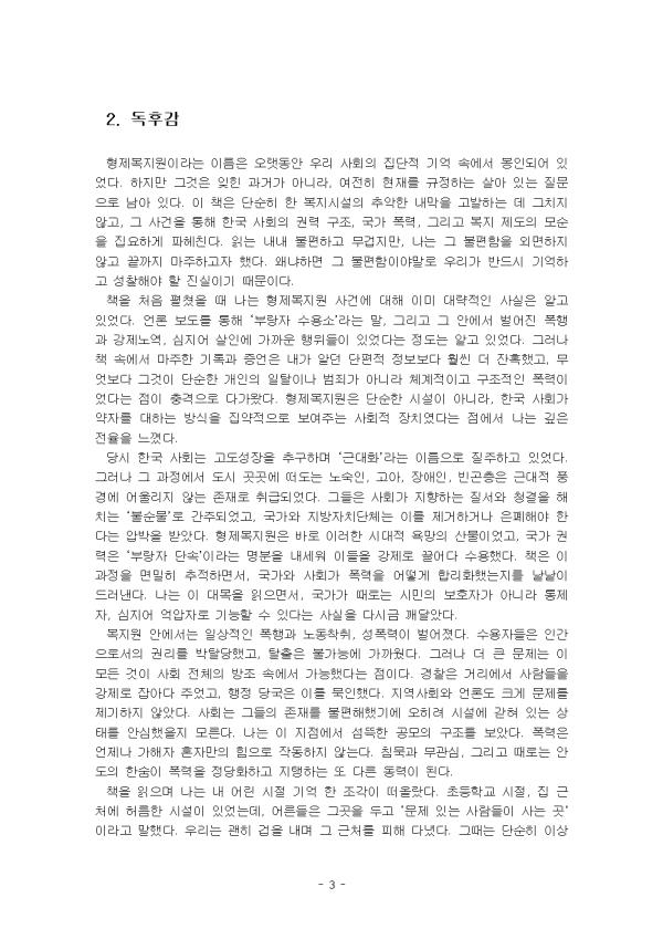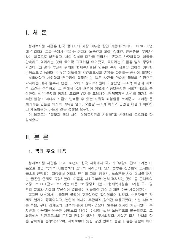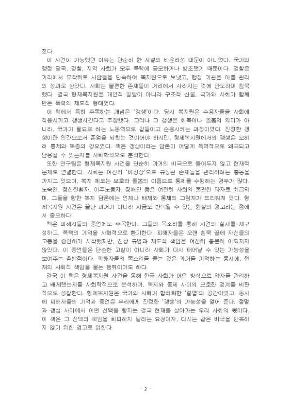 ÇüÁ¦º¹Áö¿ø »ç°ÇÀº Çѱ¹ Çö´ë»çÀÇ °¡Àå ¾îµÎ¿î Àå¸é °¡¿îµ¥ Çϳª´Ù. 1970~80³â´ë »ê¾÷ÈÀÇ ±×´Ã ¼Ó¿¡¼, ±¹°¡´Â °Å¸®ÀÇ ³ë¼÷Àΰú °í¾Æ, Àå¾ÖÀÎ, ºó°ïÃþÀ» ¡®ºÎ¶ûÀÚ¡¯¶ó´Â À̸§À¸·Î ³«ÀÎÂï°í, »çȸ Áú¼¿Í ¹Ì°üÀ» À§ÇùÇÏ´Â Á¸Àç·Î °£ÁÖÇÏ¿´´Ù. À̵éÀ» ´Ü¼ÓÇÏ°í °Ý¸®ÇÏ´Â °ÍÀÌ ±¹°¡Àû °úÁ¦Ã³·³ ¿©°ÜÁ³°í, º¹Áö¶ó´Â À̸§À» ºô·Á Á¤´çȵǾú´Ù. ±× °á°ú ºÎ»ê¿¡ À§Ä¡ÇÑ ÇüÁ¦º¹Áö¿øÀº ´Ü¼øÇÑ º¹Áö ½Ã¼³À» ³Ñ¾î¼± °Å´ëÇÑ ¼ö¿ë¼Ò·Î ±â´ÉÇϸç, ¼ö¸¹Àº À̵鿡°Ô Àΰ£À¸·Î¼ÀÇ Á¸¾öÀ» ÆÄ±«ÇÏ´Â °ø°£ÀÌ µÇ¾ú´Ù. ¼¿ï´ëÇб³ »çȸÇаú ¿¬±¸ÆÀÀÌ ÁýÇÊÇÑ ÀÌ Ã¥Àº »ç°ÇÀ» ´Ü¼øÈ÷ Æø·ÂÀÇ ÇöÀåÀ¸·Î ¹¦»çÇÏ´Â µ¥¼ ¸ØÃßÁö ¾Ê´Â´Ù. ¿ÀÈ÷·Á ÇüÁ¦º¹Áö¿øÀÌ °¡´ÉÇß´ø ±¸Á¶Àû ¹è°æ°ú »çȸÀû Á¶°ÇÀ» ÃßÀûÇϰí, ±× ¼Ó¿¡¼ ±¹°¡ ±Ç·ÂÀÌ ¾î¶»°Ô ÀÛµ¿Çß´ÂÁö¸¦ »çȸÇÐÀûÀ¸·Î ºÐ¼®ÇÑ´Ù. Ã¥Àº º¹Áö¿Í ÅëÁ¦ÀÇ ¸ðÈ£ÇÑ °æ°è¸¦ µå·¯³»¸ç, ÇüÁ¦º¹Áö¿ø »ç°ÇÀÌ °ú°ÅÀÇ Æ¯¼öÇÑ ÀÏÅ»ÀÌ ¾Æ´Ï¶ó Áö±Ýµµ ¹Ýº¹µÉ ¼ö ÀÖ´Â »çȸÀû À§ÇèÀÓÀ» º¸¿©ÁØ´Ù. ÀÌ·¯ÇÑ ¹®Á¦ÀǽÄÀº ´Ü¼øÇÑ ¿ª»çÀû ±â·ÏÀ» ³Ñ¾î, ¿À´Ã³¯ ¿ì¸®°¡ º¹Áö¿Í ÀαÇÀ» ¾î¶»°Ô ÀÌÇØÇϰí Á¦µµÈÇØ¾ß ÇÏ´ÂÁö ±íÀº ¼ºÂûÀ» ¿ä±¸ÇÑ´Ù. ÀÌ ·¹Æ÷Æ®´Â ¡°Àý¸ê°ú °»»ý »çÀÌ: ÇüÁ¦º¹Áö¿øÀÇ »çȸÇС±À» ¼±ÅÃÇÏ¿© µ¶ÈݨÀ» ÀÛ¼ºÇÏ¿´´Ù. II. º» ·Ð 1. Ã¥ÀÇ ÁÖ¿ä ³»¿ë ÇüÁ¦º¹Áö¿ø »ç°ÇÀº 1970~80³â´ë Çѱ¹ »çȸ¿¡¼ ±¹°¡°¡ ¡®ºÎ¶ûÀÚ ´Ü¼Ó¡¯À̶ó´Â À̸§À¸·Î ¹úÀÎ Æø·ÂÀû »çȸÁ¤Ã¥ÀÇ Áý¾àÀû »ç·Ê¿´´Ù. ´ç½Ã Á¤ºÎ´Â »ê¾÷È¿Í µµ½ÃȰ¡ ±Þ¼ÓÈ÷ ÁøÇàµÇ´Â °úÁ¤¿¡¼ °Å¸®ÀÇ ºó¹Î°ú °í¾Æ, Àå¾ÖÀÎ, ³ë¼÷ÀÎÀ» »çȸ Áú¼¸¦ ÇØÄ¡´Â ºÒ¿ÂÇÑ Á¸Àç·Î ±ÔÁ¤ÇÏ¿´´Ù. À̵éÀ» »çȸ·ÎºÎÅÍ ºÐ¸®¡¤°Ý¸®ÇÏ´Â °ÍÀÌ °ð ±Ù´ëÈÀÇ °úÁ¤À¸·Î ¿©°ÜÁ³°í, º¹Áö¶ó´Â À̸§À¸·Î Á¤´çȵǾú´Ù. ÇüÁ¦º¹Áö¿øÀº ±×·¯ÇÑ ±¹°¡ ±Ç·ÂÀÇ ÇÊ¿ä¿Í »çȸÀÇ ¹«°ü½ÉÀÌ °áÇÕÇÏ¿© ¸¸µé¾îÁø °¡Àå °Å´ëÇÑ ¼ö¿ë ½Ã¼³À̾ú´Ù. º¹Áö¿ø ³»ºÎ¿¡¼´Â ²ûÂïÇÑ Æø·ÂÀÌ ±¸Á¶ÀûÀ¸·Î ÀÏ»óȵǾî ÀÖ¾ú´Ù. ¼ö¿ëÀÚµéÀº °Á¦·Î ²ø·Á¿Í µî·ÏµÇ¾ú°í, º»ÀÎÀÇ ÀÇ»ç¿Í ¹«°üÇÏ°Ô Àå±â°£ ¼ö¿ëµÇ¾ú´Ù. ½Ã¼³ ³»¿¡¼´Â ÆøÇà, ±¸Å¸, °Á¦³ë¿ª, ¼ºÆø·Â µîÀÌ ¹Ýº¹µÇ¾úÀ¸¸ç, Å»ÃâÀº öÀúÈ÷ Â÷´ÜµÇ¾ú´Ù. º¹Áö¿øÀÇ ¼ö¿ëÀÚ´Â ´Ü¼øÇÑ »ýȰº¸È£ ´ë»óÀÌ ¾Æ´Ï¶ó, °ª½Ñ ³ëµ¿·ÂÀ¸·Î Ȱ¿ëµÇ¾ú°í, ±× °úÁ¤¿¡¼ Àΰ£À¸·Î¼ÀÇ Á¸¾ö°ú ±Ç¸®´Â öÀúÈ÷ ¹«½ÃµÇ¾ú´Ù. ½Ã¼³Àº ¸¶Ä¡ ÇϳªÀÇ ÀÛÀº °¨¿Áó·³ ¿î¿µµÇ¾úÀ¸¸ç, »çȸ·ÎºÎÅÍ ÀØÈù °ø°£ ¾È¿¡¼ Àý¸ê°ú °°Àº °æÇèÀÌ À̾îÁ³´Ù. ÀÌ »ç°ÇÀÌ °¡´ÉÇß´ø ÀÌÀ¯´Â ´Ü¼øÈ÷ ÇÑ ½Ã¼³ÀÇ ºñÀ±¸®¼º ¶§¹®ÀÌ ¾Æ´Ï¾ú´Ù. ±¹°¡¿Í ÇàÁ¤ ´ç±¹, °æÂû, Áö¿ª »çȸ°¡ ¸ðµÎ Æø·Â¿¡ °ø¸ðÇϰųª ¹æÁ¶Ç߱⠶§¹®ÀÌ´Ù. °æÂûÀº °Å¸®¿¡¼ ¹«ÀÛÀ§·Î »ç¶÷µéÀ» ´Ü¼ÓÇÏ¿© º¹Áö¿øÀ¸·Î º¸³Â°í, ÇàÁ¤ ±â°üÀº À̸¦ °ü¸®ÀÇ ¼º°ú·Î »ï¾Ò´Ù. »çȸ´Â ºÒÆíÇÑ Á¸ÀçµéÀÌ °Å¸®¿¡¼ »ç¶óÁö´Â °Í¿¡ ¾ÈµµÇϸç ħ¹¬Çß´Ù. °á±¹ ÇüÁ¦º¹Áö¿øÀº °³ÀÎÀû ÀÏÅ»ÀÌ ¾Æ´Ï¶ó ±¸Á¶Àû »ê¹°, ±¹°¡¿Í »çȸ°¡ ÇÔ²² ¸¸µç Æø·ÂÀÇ Á¦µµÀû ÇüÅ¿´´Ù. ÀÌ Ã¥¿¡¼ ƯÈ÷ ÁÖ¸ñÇÏ´Â °³³äÀº ¡®°»»ý¡¯ÀÌ´Ù. ´ç½Ã º¹Áö¿øÀº ¼ö¿ëÀÚµéÀ» »çȸ¿¡ ÀûÀÀ½ÃŰ°í °»»ý½ÃŲ´Ù°í ÁÖÀåÇß´Ù. ±×·¯³ª ±× °»»ýÀº ȸº¹À̳ª µ¹º½ÀÇ Àǹ̰¡ ¾Æ´Ï¶ó, ±¹°¡°¡ ÇÊ¿ä·Î ÇÏ´Â ³ëµ¿·ÂÀ¸·Î ±æµéÀÌ°í ¼øÀÀ½ÃŰ´Â °úÁ¤À̾ú´Ù. ÁøÁ¤ÇÑ °»»ýÀ̶õ Àΰ£À¸·Î¼ Á¸¾öÀ» µÇã´Â °ÍÀ̾î¾ß ÇÏÁö¸¸, ÇüÁ¦º¹Áö¿ø¿¡¼ÀÇ °»»ýÀº ¿ÀÈ÷·Á ÅëÁ¦¿Í º¹Á¾ÀÇ °¿ä¿´´Ù. Ã¥Àº °»»ýÀ̶ó´Â ´ã·ÐÀÌ ¾î¶»°Ô Æø·ÂÀûÀ¸·Î ¿Ö°îµÇ°í ³²¿ëµÉ ¼ö ÀÖ´ÂÁö¸¦ »çȸÇÐÀûÀ¸·Î ºÐ¼®ÇÑ´Ù. ¶ÇÇÑ ¿¬±¸ÆÀÀº ÇüÁ¦º¹Áö¿ø »ç°ÇÀ» ´Ü¼øÈ÷ °ú°ÅÀÇ ºñ±ØÀ¸·Î ¹¯¾îµÎÁö ¾Ê°í ÇöÀçÀû ¹®Á¦·Î ¿¬°áÇÑ´Ù. »çȸ´Â ¿©ÀüÈ÷ ¡®ºñÁ¤»ó¡¯À¸·Î ±ÔÁ¤µÈ Á¸ÀçµéÀ» °ü¸®ÇÏ·Á´Â Ãæµ¿À» °¡Áö°í ÀÖÀ¸¸ç, º¹Áö Á¦µµ´Â º¸È£¿Í µ¹º½ÀÇ À̸§À¸·Î ÅëÁ¦¸¦ ¼öÇàÇÏ´Â °æ¿ì°¡ ¸¹´Ù. ³ë¼÷ÀÎ, Á¤½ÅÁúȯÀÚ, ÀÌÁֳ뵿ÀÚ, Àå¾ÖÀÎ µîÀº ¿©ÀüÈ÷ »çȸÀÇ ºÒÆíÇÑ Å¸ÀÚ·Î Ãë±ÞµÇ¸ç, ±×µéÀ» ÇâÇÑ º¹Áö ´ã·Ð¿¡´Â ¾ðÁ¦³ª ¹èÁ¦¿Í ÅëÁ¦ÀÇ ±×¸²ÀÚ°¡ µå¸®¿öÁ® ÀÖ´Ù. ÇüÁ¦º¹Áö¿ø »ç°ÇÀº ³¡³ °ú°Å°¡ ¾Æ´Ï¶ó Áö±Ýµµ ¹Ýº¹µÉ ¼ö ÀÖ´Â Çö½ÇÀÇ °æ°í¶ó´Â Á¡¿¡¼ Áß¿äÇÏ´Ù. Ã¥Àº ÇÇÇØÀÚµéÀÇ Áõ¾ð¿¡µµ ÁÖ¸ñÇÑ´Ù. ±×µéÀÇ ¸ñ¼Ò¸