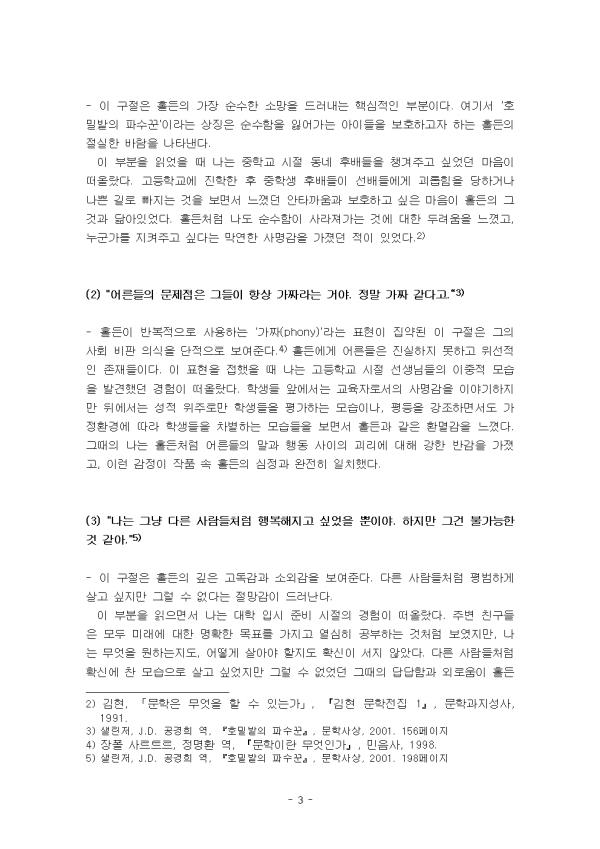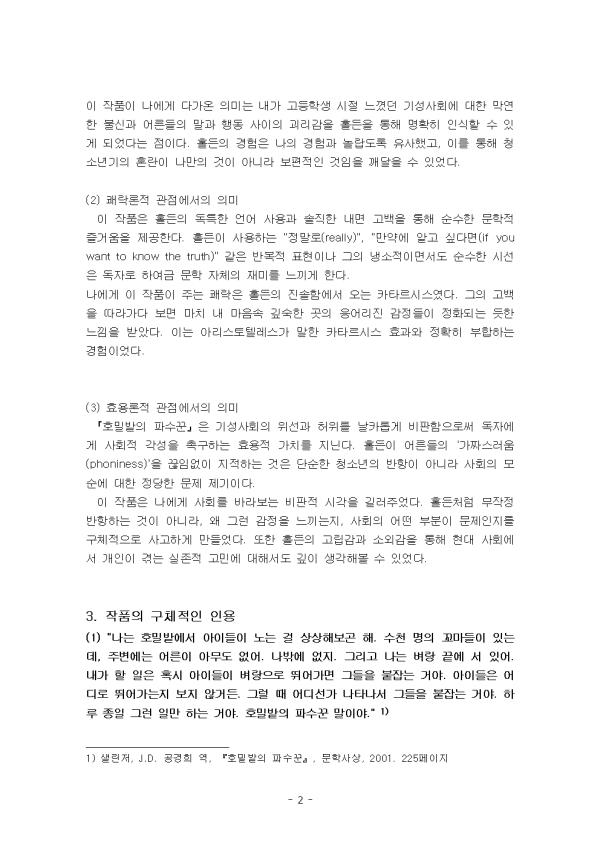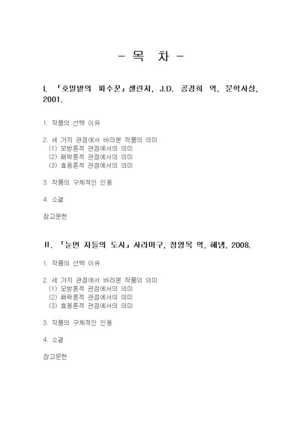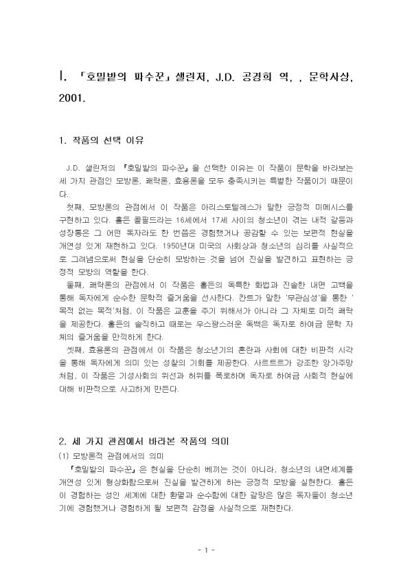 ÀÌÇØÇÏ°í ´ÙÀ½ ¼ø¼¿¡ µû¶ó °úÁ¦¹°À» ÀÛ¼ºÇϼ¼¿ä. 1) <¹®ÇÐÀÇ ÀÌÇØ> ±³Àç¿¡ ¼ö·ÏµÈ ÀÛǰ °¡¿îµ¥ µÎ ÆíÀÇ ÀÛǰ(À帣 ºÒ¹®)À» ¼±ÅÃÇØ ÀÛǰÀÌ ¼ö·ÏµÈ ÀÛǰÁý(½ÃÁý, ¼Ò¼³Áý µî)¿¡¼ ÇØ´ç ÀÛǰÀ» ã¾Æ Àаí, ÀÌ ÀÛǰÀ» ¼±ÅÃÇÏ°Ô µÈ °è±â¸¦ ±¸Ã¼ÀûÀ¸·Î ¼¼úÇϼ¼¿ä. 2) ¼±Á¤ÇÑ ÀÛǰÀÌ º»Àο¡°Ô ¾î¶² Àǹ̷Π´Ù°¡¿Ô´ÂÁö, Áï ¸ð¹æ·Ð, Äè¶ô·Ð, È¿¿ë·Ð °¡¿îµ¥ ¾î¶² °üÁ¡ÀÌ ÀÛǰÀ» ÇØ¼®ÇÏ´Â µ¥ °¡Àå ÀûÇÕÇÏ´Ù°í »ý°¢ÇÏ´ÂÁö ÀÛǰÀÇ ±¸Ã¼ÀûÀÎ ±¸ÀýÀ» ÀοëÇÏ¸ç ¼¼úÇϼ¼¿ä. µÎ ÀÛǰÀÇ ±¸ÀýÀ» °¢°¢ 3ȸ ÀÌ»ó Á÷Á¢ ÀοëÇÏ°í ±× ±¸ÀýÀÌ º»Àο¡°Ô ¿Ö ±×·¸°Ô ÇØ¼®µÇ¾ú´ÂÁö º»ÀÎÀÇ »î°ú °æÇè¿¡ ºñÃß¾î »ó¼¼È÷ ¼³¸íÇØ¾ß ÇÕ´Ï´Ù. - ¸ñ Â÷ - I. ¡¸È£¹Ð¹çÀÇ ÆÄ¼ö²Û¡¹»ø¸°Àú, J.D. °ø°æÈñ ¿ª, ¹®Çлç»ó, 2001. 1. ÀÛǰÀÇ ¼±Åà ÀÌÀ¯ 2. ¼¼ °¡Áö °üÁ¡¿¡¼ ¹Ù¶óº» ÀÛǰÀÇ ÀÇ¹Ì (1) ¸ð¹æ·ÐÀû °üÁ¡¿¡¼ÀÇ ÀÇ¹Ì (2) Äè¶ô·ÐÀû °üÁ¡¿¡¼ÀÇ ÀÇ¹Ì (3) È¿¿ë·ÐÀû °üÁ¡¿¡¼ÀÇ ÀÇ¹Ì 3. ÀÛǰÀÇ ±¸Ã¼ÀûÀÎ Àοë 4. ¼Ò°á Âü°í¹®Çå ¥±. ¡¸´«¸Õ ÀÚµéÀÇ µµ½Ã¡¹»ç¶ó¸¶±¸, Á¤¿µ¸ñ ¿ª, ÇØ³¿, 2008. 1. ÀÛǰÀÇ ¼±Åà ÀÌÀ¯ 2. ¼¼ °¡Áö °üÁ¡¿¡¼ ¹Ù¶óº» ÀÛǰÀÇ ÀÇ¹Ì (1) ¸ð¹æ·ÐÀû °üÁ¡¿¡¼ÀÇ ÀÇ¹Ì (2) Äè¶ô·ÐÀû °üÁ¡¿¡¼ÀÇ ÀÇ¹Ì (3) È¿¿ë·ÐÀû °üÁ¡¿¡¼ÀÇ ÀÇ¹Ì 3. ÀÛǰÀÇ ±¸Ã¼ÀûÀÎ Àοë 4. ¼Ò°á Âü°í¹®Çå ** ÇÔ²² Á¦°øµÇ´Â Âü°íÀÚ·á ÇÑ±ÛÆÄÀÏ ** 1. È£¹Ð¹çÀÇÆÄ¼ö²Û_ÀÛǰ¼±ÅÃÀÇÀÌÀ¯.hwp 2. È£¹Ð¹çÀÇÆÄ¼ö²Û_ÀÛǰ ¼Ó Àοë°ú ³ªÀÇ »î_°¢ÁÖÆ÷ÇÔ.hwp 3. È£¹Ð¹çÀÇÆÄ¼ö²Û_¼·Ð°úÀÛǰ¼±ÅÃÀÇÀÌÀ¯_°¢ÁÖÆ÷ÇÔ.hwp 4. È£¹Ð¹çÀÇÆÄ¼ö²Û_¸ð¹æ Äè¶ô È£¿ëÀÇ °üÁ¡_°¢ÁÖÆ÷ÇÔ.hwp 5. È£¹Ð¹çÀÇÆÄ¼ö²Û_°á·Ð(¼Ò°ß)_°¢ÁÖÆ÷ÇÔ.hwp 6. È£¹Ð¹çÀÇÆÄ¼ö²Û ÀοëºÎºÐ_°¢ÁÖÆ÷ÇÔ.hwp 7. È£¹Ð¹çÀÇ ÆÄ¼ö²Û ºÐ¼®_°¢ÁÖÆ÷ÇÔ.hwp 8. ´«¸ÕÀÚµéÀǵµ½Ã_ÀÛǰ¼±ÅÃÀÇÀÌÀ¯.hwp 9. ´«¸ÕÀÚµéÀǵµ½Ã_ÀÛǰÀÌ ³ª¿¡°Ô ´Ù°¡¿Â ÀǹÌ2.hwp 10. ´«¸ÕÀÚµéÀǵµ½Ã_ÀÛǰÀÌ ³ª¿¡°Ô ´Ù°¡¿Â ÀǹÌ.hwp 11. ´«¸ÕÀÚµéÀǵµ½Ã_ÀÛǰ¼Ó ÀοëÀ» ÅëÇÑ ³ªÀÇ »î°ú °æÇè.hwp 12. ´«¸ÕÀÚµéÀǵµ½Ã_ÀÛǰ ±¸ÀýÀ» ÅëÇÑ °³ÀÎÀû °æÇè°úÀÇ ¿¬°á_°¢ÁÖÆ÷ÇÔ.hwp 13. ´«¸ÕÀÚµéÀǵµ½Ã_°á·Ð(¼Ò°ß).hwp ¢ºÀÚ·á³»¿ë ¹Ì¸®º¸±â