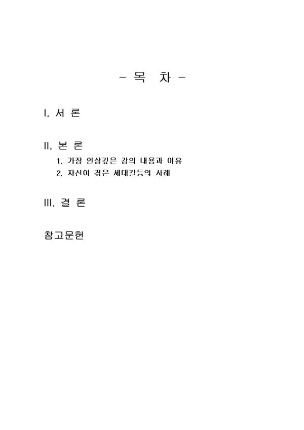 1) °¡Àå Àλó±íÀº ³»¿ëÀ» ¼¼ °³¸¦ ¼±ÅÃÇϽÿÀ. 2) ÀλóÀÌ ±íÀº ÀÌÀ¯¸¦ ÀûÀ¸½Ã¿À. 2. ÀÚ½ÅÀÌ °ÞÀº ¼¼´ë°¥µîÀÇ »ç·Ê¸¦ »ý°¢ÇØ º¸¼¼¿ä. 1) ¼¼´ë °¥µîÀÇ ³»¿ëÀ» ¼Ò°³ÇϽÿÀ. 2) ÀÌ °¥µîÀÇ ÇØ°á ¹æ¾ÈÀº ÀûÀ¸½Ã¿À. - ¸ñ Â÷ - I. ¼ ·Ð II. º» ·Ð 1. °¡Àå Àλó±íÀº °ÀÇ ³»¿ë°ú ÀÌÀ¯ 2. ÀÚ½ÅÀÌ °ÞÀº ¼¼´ë°¥µîÀÇ »ç·Ê III. °á ·Ð Âü°í¹®Çå ** ÇÔ²² Á¦°øµÇ´Â Âü°íÀÚ·á ÇÑ±ÛÆÄÀÏ ** 1. °¥µîÀÇ ³»¿ëÀº ¹«¾ùÀΰ¡.hwp 2. °¥µîÀÇ ³»¿ëÀº ¹«¾ùÀΰ¡2.hwp 3. ¼¼´ë°¥µîÀÇ ±¸Ã¼Àû »ç·Ê.hwp 4. ¼¼´ë°¥µîÀÇ ±¸Ã¼Àû »ç·Ê2.hwp 5. °¥µî ÇØ°áÀ» À§ÇÑ ±¸Ã¼Àû ¹æ¾È°¡.hwp 6. °¥µî ÇØ°áÀ» À§ÇÑ ±¸Ã¼Àû ¹æ¾È2.hwp 7. °¥µîÀÇ ¹Ù¶÷Á÷ÇÑ ÇØ°á ¹æ¾ÈÀº ¹«¾ùÀΰ¡.hwp 8. °¥µîÀÇ ¹Ù¶÷Á÷ÇÑ ÇØ°á ¹æ¾ÈÀº ¹«¾ùÀΰ¡.hwp 9. ¼·Ð ÀÛ¼º½Ã ÂüÁ¶.hwp 10. °á·Ð ÀÛ¼º½Ã ÂüÁ¶.hwp 11. ¼·Ð ÀÛ¼º½Ã ÂüÁ¶2.hwp 12. °á·Ð ÀÛ¼º½Ã ÂüÁ¶2.hwp ¢ºÀÚ·á³»¿ë ¹Ì¸®º¸±â