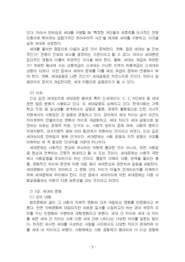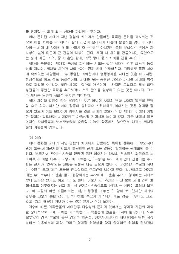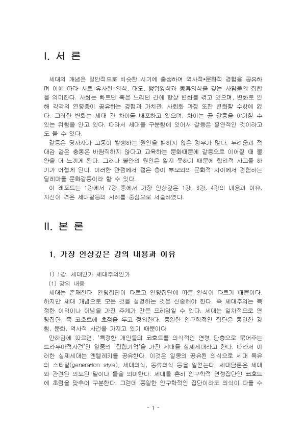 ¼¼´ëÀÇ °³³äÀº ÀϹÝÀûÀ¸·Î ºñ½ÁÇÑ ½Ã±â¿¡ Ãâ»ýÇÏ¿© ¿ª»çÀû•¹®ÈÀû °æÇèÀ» °øÀ¯Çϸç ÀÌ¿¡ µû¶ó ¼·Î À¯»çÇÑ ÀǽÄ, ŵµ, ÇàÀ§¾ç½Ä°ú µ¿·ùÀǽÄÀ» °®´Â »ç¶÷µéÀÇ ÁýÇÕÀ» ÀǹÌÇÑ´Ù. »çȸ´Â ºü¸£´ø ȤÀº ´À¸®´ø °£¿¡ Ç×»ó º¯È¸¦ °Þ°í ÀÖÀ¸¸ç, º¯È·Î ÀÎÇØ °¢°¢ÀÇ ¿¬·ÉÃþÀÌ °øÀ¯ÇÏ´Â °æÇè°ú °¡Ä¡°ü, »çÈ¸È °úÁ¤ ¶ÇÇÑ º¯ÈÇÒ ¼ö¹Û¿¡ ¾ø´Ù. ±×·¯ÇÑ º¯È´Â ¼¼´ë °£ Â÷À̸¦ ³»Æ÷Çϰí ÀÖÀ¸¸ç, Â÷ÀÌ´Â °ð °¥µîÀ» ¾ß±âÇÒ ¼ö ÀÖ´Â À§ÇèÀ» ¾È°í ÀÖ´Ù. µû¶ó¼ ¼¼´ë¸¦ ±¸ºÐÇÔ¿¡ ÀÖ¾î¼ °¥µîÀº ÇÊ¿¬ÀûÀÎ °ÍÀ̶ó°íµµ º¼ ¼ö ÀÖ´Ù. °¥µîÀº ´ç»çÀÚ°¡ °íÅëÀÌ ¹ß»ýÇÏ´Â ¿øÀÎÀ» ¹àÈ÷Áö ¾ÊÀº °æ¿ì°¡ ¸¹´Ù. µÎ·Á¿ò°ú Àû´ë°¨ °°Àº Ãæµ¿Àº ¹Ù¶÷Á÷ÇÏÁö ¾Ê´Ù°í ±³À°ÇÏ´Â ¹®È¶§¹®¿¡ °¥µîÀ¸·Î À̾îÁú ¶§ ºÒ¾ÈÀ» ´õ ´À³¢°Ô µÈ´Ù. ±×·¯³ª ºÒ¾ÈÀÇ ¿øÀÎÀº ¾ËÁö ¸øÇϱ⠶§¹®¿¡ ÇÕ¸®Àû »ç°í¸¦ ÇϱⰡ ¾î·Æ°Ô µÈ´Ù. ÀÌ·¯ÇÑ °üÁ¡¿¡¼ ÀþÀº ÃþÀÌ ºÎ¸ð¿ÍÀÇ ¹®ÈÀû Â÷ÀÌ¿¡¼ °æÇèÇÏ´Â µô·¹¸¶¸¦ ¹®È°¥µîÀ̶ó ÇÒ ¼ö ÀÖ´Ù. ÀÌ ·¹Æ÷Æ®´Â 1°¿¡¼ 7° Áß¿¡¼ °¡Àå Àλó±íÀº 1°, 3°, 4°ÀÇ ³»¿ë°ú ÀÌÀ¯, ÀÚ½ÅÀÌ °ÞÀº ¼¼´ë°¥µîÀÇ »ç·Ê¸¦ Áß½ÉÀ¸·Î ¼¼úÇÏ¿´´Ù. II. º» ·Ð 1. °¡Àå Àλó±íÀº °ÀÇ ³»¿ë°ú ÀÌÀ¯ 1) 1°. ¼¼´ëÀΰ¡ ¼¼´ëÁÖÀÇÀΰ¡ (1) °ÀÇ ³»¿ë ¼¼´ë´Â Á¸ÀçÇÑ´Ù. ¿¬·ÉÁý´ÜÀÌ ´Ù¸£°í ¿¬·ÉÁý´Ü¿¡ µû¸¥ ÀνÄÀÌ ´Ù¸£±â ¶§¹®ÀÌ´Ù. ÇÏÁö¸¸ ¼¼´ë °³³äÀ¸·Î ¸ðµç °ÍÀ» ¼³¸íÇÏ´Â °ÍÀº ½ÅÁßÇØ¾ß ÇÑ´Ù. Áï ¼¼´ëÁÖÀǴ ƯÁ¤ÇÑ ÀÌÀÍÀ̳ª À̳äÀ» °¡Áø ÁÖü°¡ ¸¸µç ÇÁ·¹ÀÓÀÏ ¼ö ÀÖ´Ù. ¼¼´ë´Â ÀÏÂ÷ÀûÀ¸·Î ¿¬·ÉÁý´Ü, Áï ÄÚȣƮ¿¡ ÃÊÁ¡À» µÎ°í Á¤ÀÇÇÑ´Ù. µ¿ÀÏÇÑ Àα¸ÇÐÀûÀÎ Áý´ÜÀº µ¿ÀÏÇÑ °æÇè, ¹®È, ¿ª»çÀû »ç°ÇÀ» °¡Áö°í Àֱ⠶§¹®ÀÌ´Ù. ¸¸ÇÏÀÓ¿¡ µû¸£¸é, ¡®Æ¯Á¤ÇÑ °³ÀεéÀÇ ÄÚȣƮ¸¦ ÀǽÄÀûÀÎ ¿¬·É ´ÜÃþÀ¸·Î ¹¾îÁÖ´Â Æ®¶ó¿ì¸¶Àû»ç°Ç¡¯ÀÎ ÀÏÁ¾ÀÇ ¡®ÁýÇÕ±â¾ï¡¯À» °¡Áø ¼¼´ë¸¦ ½ÇÁ¦¼¼´ë¶ó°í ÇÑ´Ù. µû¶ó¼ ÀÌ·¯ÇÑ ½ÇÁ¦¼¼´ë´Â ¿£ÅÚ·¹Å°¸¦ °øÀ¯ÇÑ´Ù. À̰ÍÀº ÀÏÁ¾ÀÇ °øÀ¯µÈ ÀǽÄÀ¸·Î ¼¼´ë ƯÀ¯ÀÇ ½ºÅ¸ÀÏ(generation style), ¼¼´ëÀǽÄ, µ¿·ùÀÇ½Ä µîÀ» ÀÏÄ´´Ù. ¼¼´ë´ã·ÐÀº ¼¼´ë¿Í °ü·ÃµÈ ÀǵµµÈ ¸»À̳ª ƲÀ» ÀǹÌÇÑ´Ù. ¼¼´ë¸¦ ÈçÈ÷ Àα¸ÇÐÀû ¿¬·ÉÁý´ÜÀÎ ÄÚȣƮ¿¡ ÃÊÁ¡À» ¸ÂÃß¾î ±¸ºÐÇÑ´Ù. ±×·±µ¥ µ¿ÀÏÇÑ Àα¸ÇÐÀûÀÎ Áý´ÜÀÌ¶óµµ ÀǽÄÀÌ ´Ù¸¦ ¼ö ÀÖ´Ù. µû¶ó¼ ¸¸ÇÏÀÓÀº ¼¼´ë¸¦ ±¸ºÐÇÒ ¶§ ¡®Æ¯Á¤ÇÑ °³ÀεéÀÇ ÄÚȣƮ¸¦ ÀǽÄÀûÀÎ ¿¬·É ´ÜÃþÀ¸·Î ¹¾îÁÖ´Â ÁýÇÕ±â¾ïÀÎ Æ®¶ó¿ì¸¶Àû »ç°Ç¡¯À» ¸Å°³·Î ¼¼´ë¸¦ ±¸ºÐÇϰí, À̰ÍÀ» ½ÇÁ¦ ¼¼´ë·Î ±ÔÁ¤ÇÑ´Ù. ¼¼´ë¸¦ µÑ·¯½Ñ ÀïÁ¡À¸·Î ´ÙÀ½°ú °°Àº °ÍÀÌ Á¸ÀçÇÑ´Ù. ù°, ÀþÀº ¼¼´ë´Â ´Ã Áøº¸ÀûÀΰ¡? ¿¬·ÉÀÌ Áøº¸¿Í º¸¼ö¸¦ °áÁ¤ÇÏ´Â ±âÁØÀ̶ó°í ÇÒ ¼ö ¾ø´Ù. µû¶ó¼ ¼¼´ë·ÐÀº Áý´ÜÀûÀÎ °æÇè°ú ´õºÒ¾î ÁÖ°üÀûÀÎ ÀǽÄÀ» ºÁ¾ß ÇÑ´Ù. µÑ°, ¼¼´ë´Â °è±Þ°ú ¹«°üÇѰ¡? ºÎÀ¯ÇÑ µ¿³×¿¡ »ç´Â »óÃþ°è±ÞÀÇ ½Å¼¼´ë´Â °¡³ÇÑ Áö¿ªÀÇ ÇÏÃþ°è±ÞÀÇ ½Å¼¼´ë¿Í ¼ºÇâÀÌ ´Ù¸£´Ù. ÀÌ·± Á¡¿¡¼ ¼¼´ëÀÇ ¹®Á¦¸¦ ´Ù·ê ¶§µµ °è±ÞÀÇ ¹®Á¦¿Í ¿¬µ¿Çؼ ºÁ¾ß ÇÑ´Ù. ¼Â°, ¼¼´ë°¥µîÀº ³ª»Û °ÍÀΰ¡? ¼¼´ë°¥µîÀº ÀÚ¿¬½º·¯¿î °ÍÀÌ´Ù. µû¶ó¼ °¥µî°ü¸®ÀÇ Á¤Ä¡°¡ °³ÀÔÇÑ´Ù¸é, ¼¼´ë ŸÇùÀ¸·Î °¥µî°ü¸®°¡ µÉ ¼ö ÀÖ´Ù. (2) ÀÌÀ¯ Àλó ±íÀº ¼¼´ë³íÀÇ·Î ¼¼´ë°ü·Ã ¿ë¾î·Î ƯÈ÷ ½Å¼¼´ëÀÌ´Ù. X, Z, MZ¼¼´ë µî ¼¼´ë°ü·Ã ¸¹Àº ºÐ·ù°¡ »ç¿ëµÇ°í ÀÖ´Ù. ¶Ç ¼¼´ë°¥µîµµ ½ÉÇØÁö°í ÀÖ´Ù. Çѱ¹»çȸ´Â °¡Á· Çб³ Á÷Àå µî ÀÏ»ó»ýȰ ¿µ¿ª¿¡¼ÀÇ °¥µîÀº ¹°·Ð, °æÁ¦Àû ºÒÆòµîÀ¸·Î ÀÎÇÑ °Å½ÃÀû Â÷¿ø¿¡¼ÀÇ »çȸÁý´Ü °£ °¥µîµµ °æÇèÇϰí ÀÖ´Ù. °ÀÇ¿¡¼ ¼¼´ë Â÷ÀÌ´Â »îÀÇ Á¶°ÇÀÇ Â÷À̷κÎÅÍ ¸¸µé¾îÁö´Â ¹®ÈÀÇ Â÷ÀÌ·Î °³³äÈÇϰí, ¼¼´ë Â÷À̰¡ ¼¼´ë °¥µîÀ¸·Î ¹ßÀüÇÏ´Â ÀÌÀ¯´Â °æÁ¦Àû ÀÚ¿ø, Àα¸ÀÇ ¼ö, »çȸÀû ±ÇÀ§ÀÇ Á¸Àç ¿©ºÎ, »çȸÀû ºÐÀ§±â ¹Ì·¡ÁöÇâÀû, °ú°ÅÁöÇâÀû µî¿¡ µû¶ó Èû°ü°è°¡ º¯ÈÇÏ´Â °ÍÀ̶ó°í ÇÏ¿´´Ù. Àλó ±íÀº ¼¼´ë³íÀÇ·Î ¸¸ÇÏÀÓÀÇ ºÐ·ù ±Ù°ÅÀÌ´Ù. ¼¼´ë¹®Á¦´Â »çȸ ¿îµ¿°ú ÁöÀû ¿îµ¿ÀÇ ±¸Á¶¸¦ ÀÌÇØÇÏ´Â µ¥ ²À ÇÊ¿äÇÑ ¾È³»ÀÚµé °¡¿îµ¥ ÇϳªÀÌ´Ù. ¼¼´ë¹®Á¦´Â »çȸÀûÀÎ Çö»ó¿¡ ºÎ¼öÇÏ´Â Â÷¿ø¿¡ ºÒ°úÇÑ °ÍÀÌ ¾Æ´Ï¶ó, ¸ðµç »çȸ°¥µî Çö»ó°ú ¿¬·çµÇ´Â ±Ù¿øÀû Åä´ë¶ó°í ÇÒ ¼ö ÀÖ´Â °ÍÀÌ´Ù. ¼¼´ë¹®Á¦´Â »çȸÀû ±¹¸é¿¡¼ »çȸ°¥µîÀ» ÁÖµµÇϱ⵵ ÇÏ´Â °ÍÀÌ´Ù. ¹°ÁúÀû ÀÌÇØÀÇ »óÃæ, 