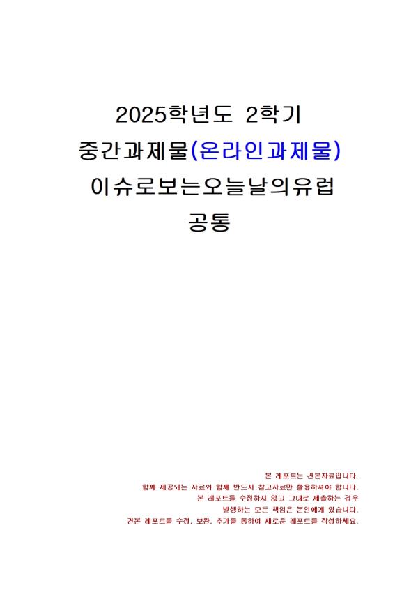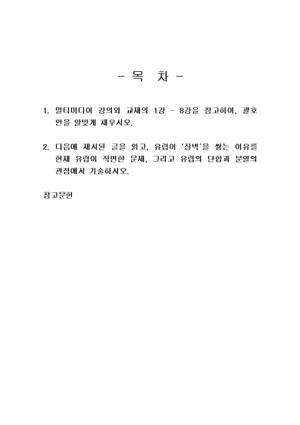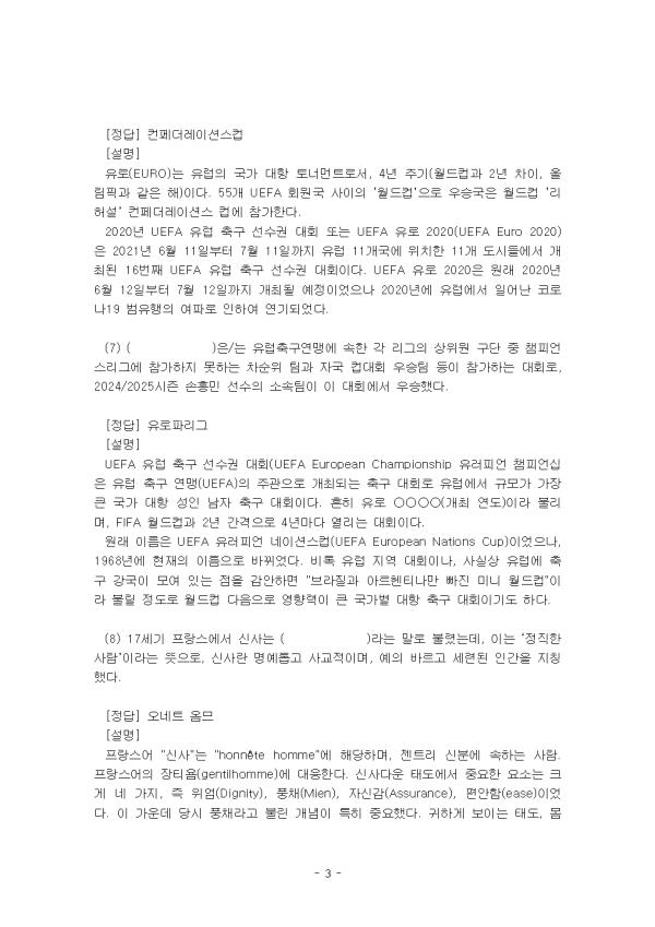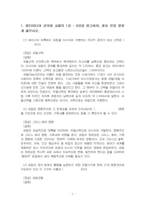 (1) À¯¶ó½Ã¾Æ ´ë·ú¿¡¼ À¯·´À» ¾Æ½Ã¾Æ¿Í ±¸ºÐÇÏ´Â Áö¸®Àû °æ°è°¡ µÇ´Â »ê¸ÆÀº( )ÀÌ´Ù. (2) À¯·´Àº ¹®ÈÀûÀ¸·Î ±× Á¤Ã¼¼ºÀ» °ÇÏ°Ô µå·¯³»´Âµ¥, ( )¹®¸íÀ»±â¹ÝÀ¸·Î Çϰí ÀÖÀ¸¸ç, ±âµ¶±³¸¦ °øÀ¯ÇÑ´Ù´Â Á¡À» ±× Ư¡À̶ó ÇÒ ¼ö ÀÖ´Ù. (3) À¯·´ÀÇ Á¤Ä¡¡¤°æÁ¦ÀÇ ÅëÇÕÀ» ½ÇÇöÇϱâ À§ÇÑ ¿¬Çձⱸ·Î ÇöÀç 27°³ ȸ¿ø±¹À¸·Î ±¸¼ºµÇ¾î ÀÖ´Â ÀÌ ±â±¸ÀÇ À̸§Àº ( )ÀÌ´Ù. (4) ( )Àº/´Â »êŸŬ·Î½ºÀÇ À¯·¡°¡ µÈ Àι°·Î, ¹Ì¶óÀÇ ÁÖ±³¿´À¸¸ç °¡³ÇÑ À̵é°ú ¾ÆÀ̵éÀ» À§ÇØ ÀÚ¼± Ȱµ¿À» Çß´Ù°í ÀüÇØÁø´Ù. (5) µ¶ÀÏ, ¿À½ºÆ®¸®¾Æ, ½ºÀ§½º µî¿¡¼ Å©¸®½º¸¶½ºÀ̺꿡 ¼±¹°À» °¡Á®´Ù ÁØ´Ù°í ¸¹ÀÌ ¹Ï´Â, º¸Åë ±Ý¹ß °ö½½¸Ó¸®ÀÇ ¼Ò³à³ª õ»ç·Î Çü»óȵǴ ȯ»óÀÇ Àι°Àº ( )ÀÌ´Ù. (6) À¯·´ÀÇ ±¹°¡ ´ëÇ× Åä³Ê¸ÕÆ® ´ëȸÀÎ À¯·Î(EURO) ¿ì½Â±¹¿¡ ÁÖ¾îÁö´Â ÇýÅà Áß Çϳª·Î, Â÷±â ¿ùµåÄÅ °³ÃÖÁö¿¡¼ Ä¡·¯Áö´Â ÀÏÁ¾ÀÇ ¡®¸®Çã¼³¡¯¿¡ ÇØ´çÇÏ´Â Ã౸´ëȸÀÇ À̸§Àº( )ÀÌ´Ù. (7) ( )Àº/´Â À¯·´Ã౸¿¬¸Í¿¡ ¼ÓÇÑ °¢ ¸®±×ÀÇ »óÀ§¿ø ±¸´Ü Áß Ã¨ÇǾ𽺸®±×¿¡ Âü°¡ÇÏÁö ¸øÇÏ´Â Â÷¼øÀ§ ÆÀ°ú ÀÚ±¹ ÄÅ´ëȸ ¿ì½ÂÆÀ µîÀÌ Âü°¡ÇÏ´Â ´ëȸ·Î, 2024/2025½ÃÁð ¼ÕÈï¹Î ¼±¼öÀÇ ¼Ò¼ÓÆÀÀÌ ÀÌ ´ëȸ¿¡¼ ¿ì½ÂÇß´Ù. (8) 17¼¼±â ÇÁ¶û½º¿¡¼ ½Å»ç´Â ( )¶ó´Â ¸»·Î ºÒ·È´Âµ¥, ÀÌ´Â ¡®Á¤Á÷ÇÑ »ç¶÷¡¯À̶ó´Â ¶æÀ¸·Î, ½Å»ç¶õ ¸í¿¹·Ó°í »ç±³ÀûÀ̸ç, ¿¹ÀÇ ¹Ù¸£°í ¼¼·ÃµÈ Àΰ£À» ÁöĪÇß´Ù. (9) ³ëºí·¹½º ¿Àºí¸®ÁÖÀÇ º»·¡ Àǹ̴ ¡°±ÍÁ·Àº ( )À»/¸¦ °®´Â´Ù¡±´Â ¶æÀÌ´Ù. (10) µ¶ÀÏ ³¶¸¸ÁÖÀǸ¦ ´ëÇ¥Çϸç Çö´ëÀû ÀǹÌÀÇ ¾Æµ¿¹®ÇÐÀÌ Åº»ýÇϴµ¥ Áß¿äÇÑ ¿ªÇÒÀ» ÇÑ ÀÛ°¡´Â ( )ÀÌ´Ù. (11) À¯·´¿¡¼ µ¿¹° ½Å¶ûÀÇ À̾߱â´Â ½ºÆ®¶óÆÄ·Ñ¶ó°¡ 16¼¼±â¿¡ ÃâÆÇÇÑ ¡ºÈï°Ü¿î ¹ã¡»¿¡¼ ¹ß°ßÇÒ ¼ö ÀÖ´Ù. ±× Áß ¡¸¹Ì³à¿Í ¾ß¼ö¡¹¿¡ ³ª¿À´Â ¸ðƼºê°¡ µîÀåÇÏ´Â À̾߱â´Â( )ÀÌ´Ù. (12) 2015³âºÎÅÍ ³ë¸£¿þÀÌ¿¡¼ ¹æ¿µµÇ¾ú´ø ÇÏÀÌÆ¾ µå¶ó¸¶·Î, Àü¼¼°èÀûÀÎ ½Åµå·ÒÀ» ÀÏÀ¸Å°¸ç À¯·´ °¢±¹¿¡¼ ¸®¸ÞÀÌÅ©µÈ ÀÛǰÀÇ Á¦¸ñÀº ( )ÀÌ´Ù. (13) Æ÷½ºÆ®¸ð´õ´ÏÁòÀ̶ó´Â ¿ë¾î°¡ óÀ½ µîÀåÇÑ °ÍÀº 1917³â µ¶ÀÏÀÇ Ã¶Çа¡ ·çµ¹ÇÁ ÆÇºñÃ÷ÀÇ ( )¶ó´Â Àú¼¿¡¼ÀÌ´Ù. (14) 1949³â¿¡ ¹ßÇ¥ÇÑ Àú¼ ¡ºÁ¦2ÀÇ ¼º¡»¿¡¼ ¡°¿©¼ºÀº ¿©¼ºÀ¸·Î ž´Â °ÍÀÌ ¾Æ´Ï¶ó ±×·¸°Ô ¸¸µé¾îÁö´Â °Í¡±À̶ó°í ÁÖÀåÇÑ Æä¹Ì´ÏÁò À̷а¡ÀÇ À̸§Àº ( )ÀÌ´Ù. (15) ÇÁ·ÎÀÌÆ®ÀÇ ( ) ÀÌ·ÐÀº ¼º°ú °ü·ÃµÈ ¿¡³ÊÁö¿Í Ãæµ¿À» Åä´ë·Î ¼¼¿î ÀÌ·ÐÀÌ´Ù. À̰ÍÀÇ Á¤»óÀûÀÎ ¹ß´Þ ´Ü°è¸¦ °ÅÄ£ ¼ºÀÎÀÇ °æ¿ì, Ãæµ¿µéÀº ½É¸®Àû ½ÇÇö¸¸À¸·Îµµ ÇØ¼ÒµÇÁö¸¸, ±×·¸Áö ¾ÊÀ» °æ¿ì Á¤½Åº´¸®ÇÐÀû Ä¡·á°¡ ÇÊ¿äÇÏ´Ù°í ÁÖÀåÇß´Ù. 2. ´ÙÀ½¿¡ Á¦½ÃµÈ ±ÛÀ» Àаí, À¯·´ÀÌ ¡®À庮¡¯À» ½×´Â ÀÌÀ¯¸¦ ÇöÀç À¯·´ÀÌ Á÷¸éÇÑ ¹®Á¦, ±×¸®°í À¯·´ÀÇ ´ÜÇÕ°ú ºÐ¿ÀÇ °üÁ¡¿¡¼ ±â¼úÇϽÿÀ. - ¸ñ Â÷ - 1. ¸ÖƼ¹Ìµð¾î °ÀÇ¿Í ±³ÀçÀÇ 1° – 8°À» Âü°íÇÏ¿©, °ýÈ£ ¾ÈÀ» ¾Ë¸Â°Ô ä¿ì½Ã¿À. 2. ´ÙÀ½¿¡ Á¦½ÃµÈ ±ÛÀ» Àаí, À¯·´ÀÌ ¡®À庮¡¯À» ½×´Â ÀÌÀ¯¸¦ ÇöÀç À¯·´ÀÌ Á÷¸éÇÑ ¹®Á¦, ±×¸®°í À¯·´ÀÇ ´ÜÇÕ°ú ºÐ¿ÀÇ °üÁ¡¿¡¼ ±â¼úÇϽÿÀ. Âü°í¹®Çå ** ÇÔ²² Á¦°øµÇ´Â Âü°íÀÚ·á ÇÑ±ÛÆÄÀÏ ** 1. À¯·´ÀÇ ´ÜÇÕ°ú ºÐ¿ÀÇ °üÁ¡.hwp 2. À¯·´ÀÇ ´ÜÇÕ°ú ºÐ¿ÀÇ °üÁ¡2.hwp 3. À¯·´ÀÇ ´ÜÇÕ°ú ºÐ¿ÀÇ °üÁ¡3.hwp 4. À¯·´ÀÌ ¡®À庮¡¯À» ½×´Â ÀÌÀ¯ – ÇöÀç Á÷¸éÇÑ ¹®Á¦.hwp 5. À¯·´ÀÌ ¡®À庮¡¯À» ½×´Â ÀÌÀ¯ – ÇöÀç Á÷¸éÇÑ ¹®Á¦2.hwp 6. À¯·´ÀÌ ¡®À庮¡¯À» ½×´Â ÀÌÀ¯ – ÇöÀç Á÷¸éÇÑ ¹®Á¦3.hwp ¢ºÀÚ·á³»¿ë ¹Ì¸®º¸±â