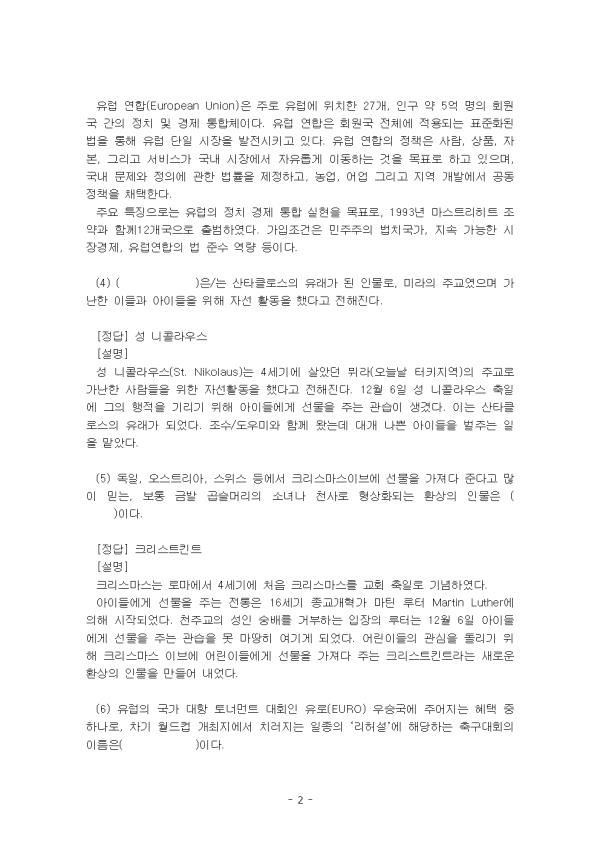 (1) À¯¶ó½Ã¾Æ ´ë·ú¿¡¼ À¯·´À» ¾Æ½Ã¾Æ¿Í ±¸ºÐÇÏ´Â Áö¸®Àû °æ°è°¡ µÇ´Â »ê¸ÆÀº ( )ÀÌ´Ù. [Á¤´ä] ¿ì¶ö»ê¸Æ [¼³¸í] ¿ì¶ö»ê¸Æ Ä«ÀÚÈ彺ź ºÏºÎ¿¡¼ ºÏ±ØÇرîÁö ·¯½Ã¾Æ¸¦ ³²ºÏÀ¸·Î Á¾´ÜÇÏ´Â »ê¸ÆÀÌ´Ù. ¾Æ½Ã¾Æ¿Í À¯·´ÀÇ °æ°è¸¦ Çü¼ºÇÏ¸ç ±æÀÌ´Â ¾à 2,500km, Æò±Õ Ç¥°í´Â 900m¿¡¼ 1200m¿¡ À̸¥´Ù. »ê¸ÆÀÇ ÃÖ°íºÀÀº ³ª·Îµå³ª¾ß»ê(³ôÀÌ 1,895m)ÀÌ´Ù. ¿ì¶ö(¬µ¬â¬Ñ¬Ý)À̶ó´Â À̸§ÀÌ Ã³À½ µîÀåÇÏ´Â °ÍÀº 16¼¼±â¿¡¼ 17¼¼±â »çÀÌ ·¯½Ã¾ÆÀÇ ½Ãº£¸®¾Æ Á¤º¹ÀÌ ÀÌ·ç¾îÁú ¶§ÀÌ´Ù. 13¼¼±âºÎÅÍ ¹Ù½Ã۸£¿¡¼´Â ¿µ¿õ ¿ì¶ö(¿ì¶ö ¹ÙƼ¸£)¿¡ ´ëÇÑ Àü¼³ÀÌ ÀüÇØÁ® ¿Â´Ù. ±×´Â »ç¶÷µéÀ» À§ÇØ ÀÚ½ÅÀ» Èñ»ýÇÏ¿´°í ±×·¡¼ »ê±â½¾¿¡ ¸¸µç ±×ÀÇ ¹«´ý¿¡ µ¹À» ½×¾Ò´Ù°í ÇÑ´Ù. ±× ¶§ºÎÅÍ ÀÌ »ê¸ÆÀ» ¿ì¶öÀ̶ó ºÎ¸£°Ô µÇ¾ú´Ù´Â Àü¼³ÀÌ´Ù. ¿ì¶ö»ê¸ÆÀº ºÏ±ØÇØÀÇ ÀϺÎÀÎ Ä«¶óÇØºÎÅÍ Áß¾ÓÀ¯¶ó½Ã¾Æ ½ºÅÜ ±âÈÄ Áö¿ªÀÎ Ä«ÀÚÈå ÃÊ¿ø±îÁö ³²ºÏÀ¸·Î ±æ°Ô À̾îÁ® ¾à 2,500km¿¡ ´ÞÇÑ´Ù. ¿ì¶ö»ê¸ÆÀ» ±âÁØÀ¸·Î µ¿ÂÊÀ¸·Î´Â ¾Æ½Ã¾Æ, ¼ÂÊÀ¸·Î´Â À¯·´À¸·Î ±¸ºÐÇÑ´Ù. (2) À¯·´Àº ¹®ÈÀûÀ¸·Î ±× Á¤Ã¼¼ºÀ» °ÇÏ°Ô µå·¯³»´Âµ¥, ( )¹®¸íÀ» ±â¹ÝÀ¸·Î Çϰí ÀÖÀ¸¸ç, ±âµ¶±³¸¦ °øÀ¯ÇÑ´Ù´Â Á¡À» ±× Ư¡À̶ó ÇÒ ¼ö ÀÖ´Ù. [Á¤´ä] ±×¸®½º¡¤·Î¸¶ ¹®¸í [¼³¸í] À¯·´Àº °ü½ÀÀûÀ¸·Î ´ë·úÀ» ÀǹÌÇϸç, ¿ì¶ö»ê¸ÆÀ¸·Î ¾Æ½Ã¾Æ¿Í ±¸º°ÇÑ´Ù. ¹®ÈÀûÀ¸·Î ±×¸®½º ·Î¸¶ ¹®¸í, ±âµ¶±³¿¡ ¹ÙÅÁÀ» µÐ´Ù. À¯·´ÀÇ Á¤Ã¼¼ºÀº ±×¸®½º, ·Î¸¶, ±âµ¶±³ ¹®È¿¡ ±âÃÊÇÑ °ÍÀ̶ó´Â ¡®Á¤ÅÂÀû¡¯ ÀÌÇØ¿¡ ¸Ó¹«´Â °æÇâÀÌ´Ù. °í´ë ±×¸®½º´Â öÇÐ, ¹ÎÁÖÁÖÀÇ, ÀÚÀ¯, Àΰ£ Áß½ÉÁÖÀÇ µî À¯·´ÀÇ Á¤½ÅÀÌ Åµ¿ÇÑ Áö¿ªÀÌ´Ù. ·Î¸¶°¡ ¼¼°è¸¦ Á¦ÆÐÇÏ´ø ´ç½Ã Áö¸®ÀûÀ¸·Î À¯·´°ú ¾Æ½Ã¾Æ Áö¿ªÀ» ·Î¸¶ÀÇ ¿µÅä¿¡ ÆíÀÔÇÏ¿´´Ù. À¯·´ÀÇ Á¤Ã¼¼ºÀº ¿ª»çÀû °úÁ¤ ¼Ó¿¡¼ Áö¼ÓÀûÀ¸·Î º¯È, ¹ßÀüÇÏ¿© ¿Ô´Ù´Â Á¡À» °í·ÁÇÏ¿© ¡®µ¿ÅÂÀû¡¯ °üÁ¡¿¡¼ º¸´Ù º¹ÇÕÀûÀ¸·Î ÀÌÇØÇÒ Çʿ䰡 ÀÖ´Ù. (3) À¯·´ÀÇ Á¤Ä¡¡¤°æÁ¦ÀÇ ÅëÇÕÀ» ½ÇÇöÇϱâ À§ÇÑ ¿¬Çձⱸ·Î ÇöÀç 27°³ ȸ¿ø±¹À¸·Î ±¸¼ºµÇ¾î ÀÖ´Â ÀÌ ±â±¸ÀÇ À̸§Àº ( )ÀÌ´Ù. [Á¤´ä] À¯·´¿¬ÇÕ [¼³¸í] À¯·´ ¿¬ÇÕ(European Union)Àº ÁÖ·Î À¯·´¿¡ À§Ä¡ÇÑ 27°³, Àα¸ ¾à 5¾ï ¸íÀÇ È¸¿ø±¹ °£ÀÇ Á¤Ä¡ ¹× °æÁ¦ ÅëÇÕüÀÌ´Ù. À¯·´ ¿¬ÇÕÀº ȸ¿ø±¹ Àüü¿¡ Àû¿ëµÇ´Â Ç¥ÁØÈµÈ ¹ýÀ» ÅëÇØ À¯·´ ´ÜÀÏ ½ÃÀåÀ» ¹ßÀü½Ã۰í ÀÖ´Ù. À¯·´ ¿¬ÇÕÀÇ Á¤Ã¥Àº »ç¶÷, »óǰ, ÀÚº», ±×¸®°í ¼ºñ½º°¡ ±¹³» ½ÃÀå¿¡¼ ÀÚÀ¯·Ó°Ô À̵¿ÇÏ´Â °ÍÀ» ¸ñÇ¥·Î Çϰí ÀÖÀ¸¸ç, ±¹³» ¹®Á¦¿Í Á¤ÀÇ¿¡ °üÇÑ ¹ý·üÀ» Á¦Á¤Çϰí, ³ó¾÷, ¾î¾÷ ±×¸®°í Áö¿ª °³¹ß¿¡¼ °øµ¿ Á¤Ã¥À» äÅÃÇÑ´Ù. ÁÖ¿ä Æ¯Â¡À¸·Î´Â À¯·´ÀÇ Á¤Ä¡ °æÁ¦ ÅëÇÕ ½ÇÇöÀ» ¸ñÇ¥·Î, 1993³â ¸¶½ºÆ®¸®È÷Æ® Á¶¾à°ú ÇÔ²²12°³±¹À¸·Î Ãâ¹üÇÏ¿´´Ù. °¡ÀÔÁ¶°ÇÀº ¹ÎÁÖÁÖÀÇ ¹ýÄ¡±¹°¡, Áö¼Ó °¡´ÉÇÑ ½ÃÀå°æÁ¦, À¯·´¿¬ÇÕÀÇ ¹ý Áؼö ¿ª·® µîÀÌ´Ù. (4) ( )Àº/´Â »êŸŬ·Î½ºÀÇ À¯·¡°¡ µÈ Àι°·Î, ¹Ì¶óÀÇ ÁÖ±³¿´À¸¸ç °¡³ÇÑ À̵é°ú ¾ÆÀ̵éÀ» À§ÇØ ÀÚ¼± Ȱµ¿À» Çß´Ù°í ÀüÇØÁø´Ù. [Á¤´ä] ¼º ´ÏÄݶó¿ì½º [¼³¸í] ¼º ´ÏÄݶó¿ì½º(St. Nikolaus)´Â 4¼¼±â¿¡ »ì¾Ò´ø ¹¿¶ó(¿À´Ã³¯ ÅÍŰÁö¿ª)ÀÇ ÁÖ±³·Î °¡³ÇÑ »ç¶÷µéÀ» À§ÇÑ ÀÚ¼±È°µ¿À» Çß´Ù°í ÀüÇØÁø´Ù. 12¿ù 6ÀÏ ¼º ´ÏÄݶó¿ì½º ÃàÀÏ¿¡ ±×ÀÇ ÇàÀûÀ» ±â¸®±â À§ÇØ ¾ÆÀ̵鿡°Ô ¼±¹°À» ÁÖ´Â °ü½ÀÀÌ »ý°å´Ù. ÀÌ´Â »êŸŬ·Î½ºÀÇ À¯·¡°¡ µÇ¾ú´Ù. Á¶¼ö/µµ¿ì¹Ì¿Í ÇÔ²² ¿Ô´Âµ¥ ´ë°³ ³ª»Û ¾ÆÀ̵éÀ» ¹úÁÖ´Â ÀÏÀ» ¸Ã¾Ò´Ù. (5) µ¶ÀÏ, ¿À½ºÆ®¸®¾Æ, ½ºÀ§½º µî¿¡¼ Å©¸®½º¸¶½ºÀ̺꿡 ¼±¹°À» °¡Á®´Ù ÁØ´Ù°í ¸¹ÀÌ ¹Ï´Â, º¸Åë ±Ý¹ß °ö½½¸Ó¸®ÀÇ ¼Ò³à³ª õ»ç·Î Çü»óȵǴ ȯ»óÀÇ Àι°Àº ( )ÀÌ´Ù. [Á¤´ä] Å©¸®½ºÆ®Å²Æ® [¼³¸í] Å©¸®½º¸¶½º´Â ·Î¸¶¿¡¼ 4¼¼±â¿¡ óÀ½ Å©¸®½º¸¶½º¸¦ ±³È¸ ÃàÀÏ·Î ±â³äÇÏ¿´´Ù. ¾ÆÀ̵鿡°Ô ¼±¹°À» ÁÖ´Â ÀüÅëÀº 16¼¼±â Á¾±³°³Çõ°¡ ¸¶Æ¾ ·çÅÍ Martin Luther¿¡ ÀÇÇØ ½ÃÀ۵Ǿú´Ù. õÁÖ±³ÀÇ ¼ºÀÎ ¼þ¹è¸¦ °ÅºÎÇÏ´Â ÀÔÀåÀÇ ·çÅÍ´Â 12¿ù 6ÀÏ ¾ÆÀ̵鿡°Ô ¼±¹°À» ÁÖ´Â °ü½ÀÀ» ¸ø ¸¶¶¥È÷ ¿©±â°Ô µÇ¾ú´Ù. ¾î¸°À̵éÀÇ °ü½ÉÀ» µ¹¸®±â À§ÇØ Å©¸®½º¸¶½º À̺꿡 ¾î¸°À̵鿡°Ô ¼±¹°À» °¡Á®´Ù ÁÖ´Â Å©¸®½ºÆ®Å²Æ®¶ó´Â »õ·Î¿î ȯ»óÀÇ Àι°À» ¸¸µé¾î ³»¾ú´Ù. - Áß·« - |