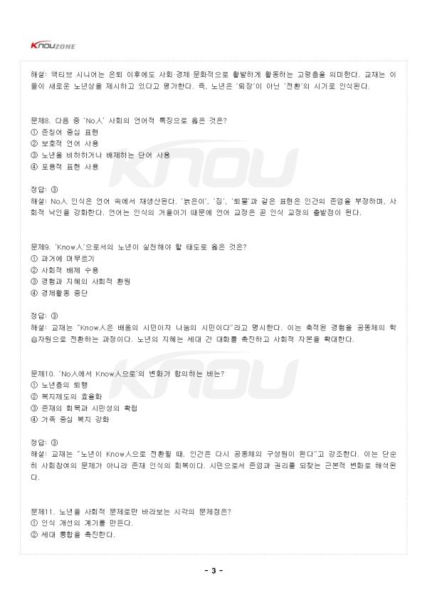 ¹®Á¦1. ¡®NoìÑ¡¯ÀÇ Àǹ̷Π°¡Àå ÀûÀýÇÑ °ÍÀº? ¨ç ³ë³âÀ» »çȸÀû ÀÚ»êÀ¸·Î ¹Ù¶óº¸´Â ÀνÄÀÌ´Ù. ¨è ³ëÀÎÀ» ºñÁ¸Àç·Î ÀνÄÇÏ´Â ºÎÁ¤Àû °üÁ¡ÀÌ´Ù. ¨é ³ë³âÀÇ ÀÚÀ²¼ºÀ» Á¸ÁßÇϴ ŵµÀÌ´Ù. ¨ê ¼¼´ë °£ ¿¬´ë¸¦ ÃËÁøÇÏ´Â °¡Ä¡ÀÌ´Ù. Á¤´ä: ¨è ÇØ¼³: NoìÑÀº ¡®¾øÀ» Ùí(¹«)¡¯¿Í »ç¶÷ ìÑ(ÀÎ)À» ÇÕ¼ºÇÑ °³³äÀ¸·Î, ³ë³âÀ» »çȸÀÇ ÁüÀ̳ª ¾µ¸ð¾ø´Â Á¸Àç·Î °£ÁÖÇÏ´Â Æí°ßÀû ÀνÄÀÌ´Ù. ÀÌ´Â »ý»ê¼º Á᫐ »çȸ°¡ ¸¸µé¾î³½ °á°úÀ̸ç, ³ëÀÎÀ» °¡Ä¡ ¾ø´Â Á¸Àç·Î Ãë±ÞÇÏ°Ô ¸¸µç´Ù. ±³Àç¿¡¼´Â ÀÌ·¯ÇÑ ÀνÄÀÌ ³ë³âÀÇ Á¸¾ö°ú ½Ã¹Î±ÇÀ» ¹ÚÅ»ÇÑ´Ù°í ºñÆÇÇÑ´Ù. ¹®Á¦2. ¡®KnowìÑ¡¯ÀÌ ÁöÇâÇÏ´Â Àΰ£»óÀ¸·Î ¿ÇÀº °ÍÀº? ¨ç »çȸÀû ºÎ´ãÀ¸·Î ¿©°ÜÁö´Â Àΰ£»ó ¨è ÁöÇý¿Í °æÇèÀ» °øÀ¯ÇÏ¸ç »çȸ¿Í ÇÔ²² ¼ºÀåÇÏ´Â Àΰ£»ó ¨é º¹ÁöÀÇ ¼öÇýÀڷθ¸ ¸Ó¹«´Â Àΰ£»ó ¨ê º¯È¿¡ ÀûÀÀÇÏÁö ¸øÇÏ´Â ¼öµ¿Àû Àΰ£»ó Á¤´ä: ¨è ÇØ¼³: KnowìÑÀº ¡®¾Æ´Â »ç¶÷¡¯, Áï °æÇè°ú Áö½ÄÀ» »çȸ¿¡ ȯ¿øÇÏ¸ç ¼¼´ë °£ ÁöÇý¸¦ ¿¬°áÇÏ´Â Á¸À縦 ÀǹÌÇÑ´Ù. ±³Àç´Â ³ë³âÀ» ¡®¹è¿ò°ú °øÇåÀÇ ½Ã¹Î¡¯À¸·Î ÀçÇØ¼®Çϸç, ÀÌ´Â »çȸ ±¸¼º¿ø ¸ðµÎ¿¡°Ô Áö¼Ó °¡´ÉÇÑ °ü°è¼ºÀ» ȸº¹½ÃŰ´Â Ãâ¹ßÁ¡ÀÌ µÈ´Ù°í ¼³¸íÇÑ´Ù. ¹®Á¦3. ¡®NoìÑ¡¯ ÀνÄÀÌ »çȸº¹Áö Á¤Ã¥¿¡ ¹ÌÄ¡´Â ºÎÁ¤Àû ¿µÇâÀ¸·Î ¿ÇÀº °ÍÀº? ¨ç ¼öÆòÀû Âü¿© È®´ë ¨è º¹Áö´ë»óÀÚ Áß½ÉÀÇ ½ÃÇýÀû Á¢±Ù °È ¨é ½Ã¹ÎÂü¿© ±â¹Ý È®´ë ¨ê ÀÚÄ¡¿ª·® °È Á¤´ä: ¨è ÇØ¼³: NoìÑÀÇ ½Ã°¢ÀÌ Á¤Ã¥¿¡ ¹Ý¿µµÇ¸é ³ëÀÎÀ» ¡®µµ¿òÀÌ ÇÊ¿äÇÑ °´Ã¼¡¯·Î ±ÔÁ¤ÇÏ°Ô µÈ´Ù. ÀÌ´Â º¹Áö¸¦ ±Ç¸®°¡ ¾Æ´Ñ ½ÃÇý·Î Àü¶ô½Ã۸ç, ³ëÀÎÀÇ ÀÚÀ²¼º°ú Âü¿©¼ºÀ» ¾àȽÃŲ´Ù. °á±¹ º¹ÁöÁ¦µµ´Â µ¹º½ÀÇ À̸§À¸·Î ½Ã¹Î±ÇÀ» Ãà¼ÒÇÏ´Â ¿ª¼³À» ³º´Â´Ù. ¹®Á¦4. ¡°³ëÀÎÀº »ê¼ÛÀåÀÌ´Ù¡±¶ó´Â Ç¥ÇöÀÌ ¹Ý¿µÇÏ´Â »çȸ ÀνÄÀº? ¨ç ³ë³âÀÇ »ý»êÀû ¿ªÇÒ °Á¶ ¨è ³ë³âÀÇ Á¸À縦 ºÎÁ¤ÇÏ´Â ³«ÀÎÀû ¾ð¾î ¨é ³ë³âÀÇ ÁöÇý¿¡ ´ëÇÑ Á¸Áß ¨ê ³ë³âÃþ º¹ÁöÀÇ ¹ßÀü Á¤´ä: ¨è ÇØ¼³: ¡®»ê¼ÛÀ塯À̶ó´Â ¸»Àº ³ëÀÎÀ» »ì¾Æ ÀÖÀ¸³ª »çȸÀûÀ¸·Î Á×Àº Á¸Àç·Î ÀνÄÇÏ´Â Æø·ÂÀû Ç¥ÇöÀÌ´Ù. ±³Àç´Â À̸¦ Àΰ£ Á¸¾ö¼º ÈѼÕÀÇ ´ëÇ¥Àû »ç·Ê·Î Á¦½ÃÇÑ´Ù. ÀÌ·¯ÇÑ ¾ð¾î´Â ³ëÀÎÀÇ »çȸÀû Âü¿©¸¦ Â÷´ÜÇϰí, ¼¼´ë °£ °Å¸®°¨À» ´õ¿í ½ÉȽÃŲ´Ù. ¹®Á¦5. ¡®KnowìÑ¡¯ °üÁ¡ÀÌ ÁöÇâÇÏ´Â »çȸÀû ¸ñÇ¥·Î ¿ÇÀº °ÍÀº? ¨ç °æÀïÀ» ÅëÇÑ ÀÚ¸³ ¨è ³ë³âÀÇ »çȸÀû Âü¿©¿Í ½Ã¹ÎÀû ¿¬´ë ¨é º¹Áö ÀÇÁ¸¼º °È ¨ê ³ë³âÃþ ºÐ¸® Á¤´ä: ¨è ÇØ¼³: KnowìÑÀº ³ë³âÀ» °øµ¿Ã¼ÀÇ ÀÏ¿øÀ¸·Î º¹±Í½ÃŰ´Â ½Ã¹Î¿îµ¿Àû Àǹ̸¦ °®´Â´Ù. ±³Àç´Â ¡°³ë³âÀÇ »îÀÌ ½Ã¹ÎÀÇ »îÀ¸·Î È®ÀåµÉ ¶§ »çȸ´Â ´õ¿í ¹ÎÁÖÀûÀÌ µÈ´Ù¡±°í °Á¶ÇÑ´Ù. ³ëÀÎÀÇ °æÇèÀº °³ÀÎÀÇ ÀÚ»êÀ» ³Ñ¾î »çȸÀû ÇнÀÀÇ ¿øÃµÀ¸·Î ÀÛ¿ëÇÑ´Ù. ¹®Á¦6. ¡®³ª´Â ´©±¸Àΰ¡¡¯¶ó´Â Áú¹®ÀÌ Á¦½ÃµÈ ÀÌÀ¯·Î °¡Àå ÀûÀýÇÑ °ÍÀº? ¨ç °æÁ¦Àû ÀÚ¸³ ¿©ºÎ È®ÀÎ ¨è °³ÀÎÀÇ Á¤Ã¼¼º ¼ºÂûÀ» ÅëÇÑ ½Ã¹ÎÀû ÁÖü Çü¼º ¨é °¡Á·°ü°èÀÇ Á߿伺 °Á¶ ¨ê ¼¼´ë ±¸ºÐÀÇ ¸íÈ®È Á¤´ä: ¨è ÇØ¼³: ±³Àç´Â ¡°½Ã¹ÎÀ¸·Î¼ÀÇ ³ë³âÀº ½º½º·ÎÀÇ Á¸À縦 ´Ù½Ã ¹¯´Â ÀÏ¿¡¼ ½ÃÀ۵ȴ١±°í ¼³¸íÇÑ´Ù. ÀÚ±â ÀÌÇØ´Â ŸÀÚ¿ÍÀÇ °ü°è ¼Ó¿¡¼ Çü¼ºµÇ¸ç, ÀÌ´Â Âü¿©ÀÇ µ¿·ÂÀÌ µÈ´Ù. ³ë³âÀÌ ÀÚ½ÅÀ» »çȸÀû Á¸Àç·Î ÀçÀνÄÇÒ ¶§ ÁøÁ¤ÇÑ ½Ã¹Î¼ºÀÌ °¡´ÉÇØÁø´Ù. - Áß·« - |