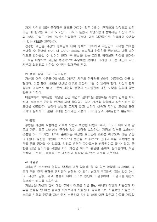 Á¤½Å°Ç°Àº °³ÀÎÀÇ »îÀÇ ÁúÀ» °áÁ¤Áþ´Â ¿ä¼ÒÀÌ´Ù. Á¤½ÅÀû ÁúȯÀÌ ¾ø´Ù´Â »óŸ¦ ³Ñ¾î, ÇູÇÑ »îÀ» ¿µÀ§Çϱâ À§ÇÑ Çʼö Á¶°ÇÀÌ´Ù. Á¤½Å°Ç°Àº °³ÀÎÀÇ °¨Á¤, »ç°í, Çൿ¿¡ ¿µÇâÀ» ¹ÌÄ¡¸ç, ŸÀΰúÀÇ °ü°è, ȯ°æ ÀûÀÀ, ÀÏ»óÀû »îÀÇ ¸¸Á·µµ¿¡ Á÷°áµÈ´Ù. Á¤½ÅÀûÀ¸·Î °Ç°ÇÑ »ç¶÷Àº ½ºÆ®·¹½º¸¦ ÀûÀýÈ÷ °ü¸®Çϰí, Çö½ÇÀûÀÎ ¸ñÇ¥¸¦ ¼³Á¤Çϸç, ŸÀΰú ±àÁ¤ÀûÀÎ °ü°è¸¦ À¯ÁöÇÒ ¼ö ÀÖ´Ù. ¿À´Ã³¯ Á¤½Å°Ç°Àº ½ÅüÀû °Ç°¸¸ÅÀ̳ª Áß¿äÇÏ°Ô Àνĵǰí¾ß ¸»¾Ò´Ù. °ú°Å¿¡´Â Á¤½ÅÀûÀÎ ¹®Á¦¸¦ °³ÀÎÀÇ ¾àÁ¡À̳ª Àγ»ºÎÁ·À¸·Î Ä¡ºÎÇÏ´Â °æÇâÀÌ ÀÖ¾úÁö¸¸, Çö´ë °úÇÐÀº ³úÀÇ ÈÇÐÀû∙±¸Á¶Àû ¿äÀÎ, ½É¸®Àû °æÇè, ȯ°æÀû ¿µÇâ µîÀÌ º¹ÇÕÀûÀ¸·Î ÀÛ¿ëÇÑ °á°úÀÓÀ» ¹àÇô³Â´Ù. µû¶ó¼ Á¤½Å°Ç°Àº ´õ ÀÌ»ó °³ÀÎÀÇ ÀÇÁö·Î¸¸ ÇØ°áÇÒ ¼ö ¾ø´Â ¹®Á¦·Î ÀνĵǸç, À̸¦ À§ÇØ Àü¹®Àû Ä¡·á, ½É¸®Àû Áö¿ø, »çȸÀû ȯ°æ °³¼±ÀÌ Áß¿äÇÏ´Ù. Àü¼¼°èÀûÀ¸·Î Á¤½Å°Ç°Àº °³ÀÎÀûÀÎ ¹®Á¦°¡ ¾Æ´Ï¶ó »çȸÀûÀÎ ¹®Á¦·Î ºÎ°¢µÇ°í ÀÖ´Â ½ÇÁ¤À» ¹Ý¿µÇÑ´Ù. ¿ì¸® »çȸ Áúȯ±¸Á¶µµ Á¡Â÷ ³ëÀμº Áúȯ ¹× Á¤½ÅÁúȯÀÌ ´Ã¾î³ª´Â ¼±Áø±¹ÇüÀ¸·Î º¯ÈÇϰí ÀÖ´Ù. Á¤½ÅÀûÀ¸·Î °Ç°ÇÏ´Ù´Â °Í¿¡ ´ëÇØ ¼¼°èº¸°Ç±â±¸(WHO)´Â °Ç°À» ¡®Áúº´ÀÌ ¾ø°Å³ª Çã¾àÇÏÁö ¾ÊÀ» »Ó¸¸ ¾Æ´Ï¶ó ½ÅüÀû, Á¤½ÅÀû, »çȸÀûÀ¸·Î ¾È³çÇÑ »óÅ¡¯·Î Á¤ÀÇÇϰí ÀÖ´Ù. Á¤½Å°Ç°À̶õ Á¤½ÅÁúȯÀÌ ¾ø°Å³ª Á¤½ÅÀûÀ¸·Î Çã¾àÇÏÁö ¾ÊÀ» »Ó ¾Æ´Ï¶ó »çȸ ¾È¿¡¼ Æí¾ÈÇÏ°Ô ±â´ÉÇÏ¿© Á¤½ÅÀûÀ¸·Î ¾È³çÇÑ »óÅÂÀÌ´Ù. Á¤½Å°Ç°ÀÇ °³³ä¿¡´Â ½ÅüÀû °Ç°°ú »çȸȯ°æÀÇ ¿µÇâ ¹× Á¤½ÅÀû ¼º¼÷ÀÇ Àǹ̰¡ Æ÷ÇԵǾî ÀÖ´Ù. Áï, Á¤½Å°Ç°Àº ½ÅüÀû °Ç°À» ÀüÁ¦·Î Çϸç ÀÚ½ÅÀÌ ¼ÓÇÑ »çȸȯ°æ°úÀÇ °ü°è¿¡¼ ¼º°øÀûÀ¸·Î ÀûÀÀÇÏ¸é¼ ³»ÀûÀÎ ¹ßÀü°ú ÀÚ±â½ÇÇöÀ» ÀÌ·ç´Â ¼º¼÷ÀÇ °³³äÀÌ Æ÷ÇԵǾî ÀÖ´Ù. ¸¶¸® ¾ßÈ£´Ù(Marie Jahoda)´Â Á¤½Å°Ç°À» Æ÷°ýÀûÀ¸·Î Á¤ÀÇÇÏ¸é¼ ¡®Áúº´ÀÇ ºÎÀ硯, ¡®Åë°èÀû Á¤»ó¼º¡¯, ¡®Çູ¡¯ ¹× ¡®¾È³ç¡¯ µî°ú °°Àº ±âÁØÀÌ ºÎÀû´çÇÏ´Ù°í ÆÇÁ¤ÇÏ´Â ±âÁØÀ» Á¦½ÃÇÏ¿´´Ù. ÀÌ ·¹Æ÷Æ®´Â ¸¶¸® ¾ßÈ£´Ù°¡ Á¦½ÃÇÏ´Â ÀÌ»óÀûÀÎ Á¤½Å°Ç°ÀÇ ¿©¼¸ °¡Áö ±âÁØÀ» Á¦½ÃÇϰí, °¢ ±âÁØÀÇ Àǹ̸¦ ¼¼úÇÏ¿´´Ù. ±×¸®°í ¸¶¸® ¾ßÈ£´Ù°¡ Á¦½ÃÇÑ °¢ ±âÁØÀÌ °³ÀÎÀÇ Á¤½Å°Ç°°ú »îÀÇ ÀûÀÀ¿¡ ¹ÌÄ¡´Â ¿µÇâ°ú Á߿伺¿¡ ´ëÇØ ÀÚ½ÅÀÇ °ßÇØ¸¦ ¼¼úÇÏ¿´´Ù. II. º» ·Ð 1. ¸¶¸® ¾ßÈ£´ÙÀÇ ÀÌ»óÀûÀÎ Á¤½Å°Ç° ±âÁØ 1) Àڽſ¡ ´ëÇÑ Åµµ ÀÚ±â Àڽſ¡ ´ëÇÑ ±àÁ¤ÀûÀΠŵµ¸¦ °¡Áö´Â °ÍÀº °³ÀÎÀÌ °Ç°ÇÏ°Ô ¼ºÀåÇÏ°í ¹ßÀüÇÏ´Â µ¥ Áß¿äÇÑ ¿ä¼Ò·Î ¿©°ÜÁø´Ù. ³ªÀ̰¡ µé¸é¼ ÀÚ¿¬½º·´°Ô º¯ÈÇÏ´Â ÀÚ½ÅÀÇ ¿Ü¸ð¿Í ´É·Â, ±×¸®°í ÀÌ¿¡ ±â¹ÝÇÑ Çö½ÇÀûÀÎ Æ÷ºÎ¿¡ ´ëÇØ °´°üÀûÀ¸·Î ÀνÄÇÏ°í ¼ö¿ëÇÒ ¼ö Àִ ŵµ¸¦ ÀÏÄ´´Ù. °Ç°ÇÑ °³ÀÎÀº ÀÚ½ÅÀÇ Á¤Ã¼°¨¿¡ ´ëÇØ ¸íÈ®È÷ ÀÌÇØÇϰí ÀڽŸ¸ÀÇ °íÀ¯ÇÑ Àǹ̸¦ ºÎ¿©ÇÒ ¼ö ÀÖ¾î¾ß Çϸç, ´õ ³ª¾Æ°¡ ½º½º·Î ¼Ò¼Ó°¨°ú ¾ÈÁ¤°¨À» Çü¼ºÇϰí À̸¦ ³»¸éÀûÀ¸·Î ¹Þ¾ÆµéÀÏ ¼ö ÀÖ¾î¾ß ÇÑ´Ù. Áï Çö½ÇÀ» ÀÖ´Â ±×´ë·Î ¹Ù¶óº¸¸ç ÀÚ½ÅÀ» Æò°¡Çϰí, À̸¦ ¹ÙÅÁÀ¸·Î ÀÚ½ÅÀ» Àû±ØÀûÀ¸·Î ¼ö¿ëÇÏ´Â °ÍÀÌ´Ù. ÀÌ·¯ÇÑ Åµµ´Â °³ÀÎÀÌ ÀÚ±â ÀڽŰú ÈÇØÇÏ°í ¼ºÀåÇÒ ¼ö ÀÖ´Â ¹Ø°Å¸§ÀÌ µÈ´Ù. 2) ¼ºÀå, ¹ß´Þ ±×¸®°í ÀھƽÇÇö Àڽſ¡ ´ëÇÑ ¼ö¿ëÀ» ±â¹ÝÀ¸·Î, °³ÀÎÀº ÀÚ½ÅÀÇ ÀáÀç·ÂÀ» ÃæºÐÈ÷ °è¹ßÇϰí À̸¦ ½ÇÇöÇϸç, À̸¦ ÅëÇØ »õ·Î¿î ¼ºÀåÀ» ÀÌ·ç°í µµÀü¿¡ ³ª¼³ ¼ö ÀÖ¾î¾ß ÇÑ´Ù. ÀÚ½ÅÀÇ ÇöÀç »óÅ¿¡ ¸Ó¹«¸£Áö ¾Ê°í ²ÙÁØÈ÷ °³ÀÎÀû ¼ºÀå°ú ÀÚ±â¹ßÀü¿¡ ´ëÇÑ ³ë·ÂÀ» ¸ØÃßÁö ¾Ê´Â °ÍÀ» ÀǹÌÇÑ´Ù. ¸Å½½·Î¿ìÀÇ ÀھƽÇÇö °³³äÀº Àΰ£ ³»¸éÀÇ ÀáÀç·ÂÀ» ½ÇÇöÇÏ´Â ÃÖ»óÀÇ ´Ü°è¸¦ Á¦½ÃÇϸç, ·ÎÀú½º´Â ÀüÀÎÀû Àΰ£ÀÌ µÇ¾î ²÷ÀÓ¾øÀÌ ÀÚ±â ÀÚ½ÅÀ» È®ÀåÇÏ°í ¹ßÀü½ÃŰ´Â Á߿伺À» °Á¶ÇÑ´Ù. ¹°¸®Àû ¼ºÀå¿¡ ±×Ä¡Áö ¾Ê°í ½É¸®Àû ¼º¼÷°ú ÁöÀûÀÎ µµÀüÀ» ÅëÇØ °¢ÀÚÀÇ »î¿¡¼ ´õ ±íÀº Àǹ̸¦ ã¾Æ°¡´Â °úÁ¤ÀÌ ¹Ù·Î ¼ºÀå°ú ÀھƽÇÇöÀÇ º»ÁúÀÌ´Ù. 3) ÅëÇÕ ÅëÇÕÀº ÀÚ½ÅÀÌ Ç¥ÇöÇÏ´Â ¿ÜºÎÀû ¸ð½À°ú ¾ï¾ÐµÈ ³»¸éÀû ¿å±¸, ±×¸®°í ³»Àû∙¿ÜÀû °¥µî°ú °¨Á¤, Ãæµ¿ »çÀÌ¿¡¼ ±ÕÇüÀ» ã´Â °úÁ¤À» Æ÷ÇÔÇÑ´Ù. °¨Á¤°ú Á¤¼¸¦ Á¶À²ÇÏ´Â °Í»Ó¸¸ ¾Æ´Ï¶ó °³ÀÎ ³»ºÎ¿¡ Á¸ÀçÇÏ´Â º¹ÀâÇÑ ¿ä¼ÒµéÀÌ Á¶È¸¦ ÀÌ·çµµ·Ï ÇÏ´Â °ÍÀ» ÀǹÌÇÑ´Ù. ÅëÇÕÀº °³ÀÎÀÌ ½ºÆ®·¹½º¿Í ºÒ¾ÈÀ» È¿°úÀûÀ¸·Î °ßµð°í À̸¦ ±Øº¹ÇÏ´Â ´É