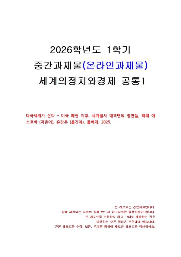 ´Ù±Ø¼¼°è°¡ ¿Â´Ù - ¹Ì±¹ ÆÐ±Ç ÀÌÈÄ, ¼¼°èÁú¼ ´ë°Ýº¯ÀÇ Àå¸éµé, ÆäÆä ¿¡½ºÄÚ¹Ù (ÁöÀºÀÌ), À¯°Àº (¿Å±äÀÌ), µ¹º£°³, 2025. - ¸ñ Â÷ - I. ¼ ·Ð II. º» ·Ð 1. Ã¥ÀÇ ÁÖ¿ä ³»¿ë 2. ÀÛ¼ºÀÚÀÇ ¼Æò III. °á ·Ð Âü°í¹®Çå ** ÇÔ²² Á¦°øµÇ´Â Âü°íÀÚ·á ÇÑ±ÛÆÄÀÏ ** 1. ´Ù±Ø¼¼°è°¡ ¿Â´Ù - ¹Ì±¹ ÆÐ±Ç ÀÌÈÄ, ¼¼°èÁú¼ ´ë°Ýº¯ÀÇ Àå¸éµé.hwp 2. ´Ù±Ø¼¼°è°¡ ¿Â´Ù - ¹Ì±¹ ÆÐ±Ç ÀÌÈÄ, ¼¼°èÁú¼ ´ë°Ýº¯ÀÇ Àå¸éµé2.hwp 3. ´Ù±Ø¼¼°è°¡ ¿Â´Ù - ¹Ì±¹ ÆÐ±Ç ÀÌÈÄ, ¼¼°èÁú¼ ´ë°Ýº¯ÀÇ Àå¸éµé3.hwp ¢ºÀÚ·á³»¿ë ¹Ì¸®º¸±â